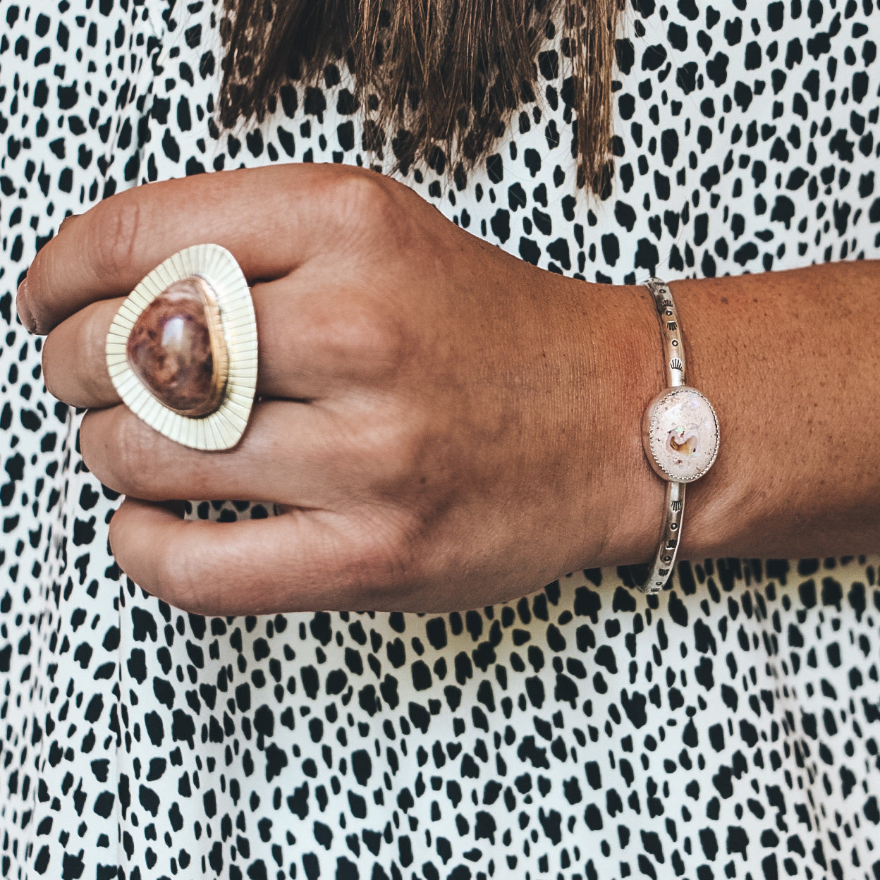 This one-of-a-kind cuff features a Mexican Opal with a sandy brown matrix and a central pocket of glittering opal fire, which flashes intensely in purple, orange, yellow, and green. This cuff is made from sterling silver and fine silver, and features a hand-stamped band.
