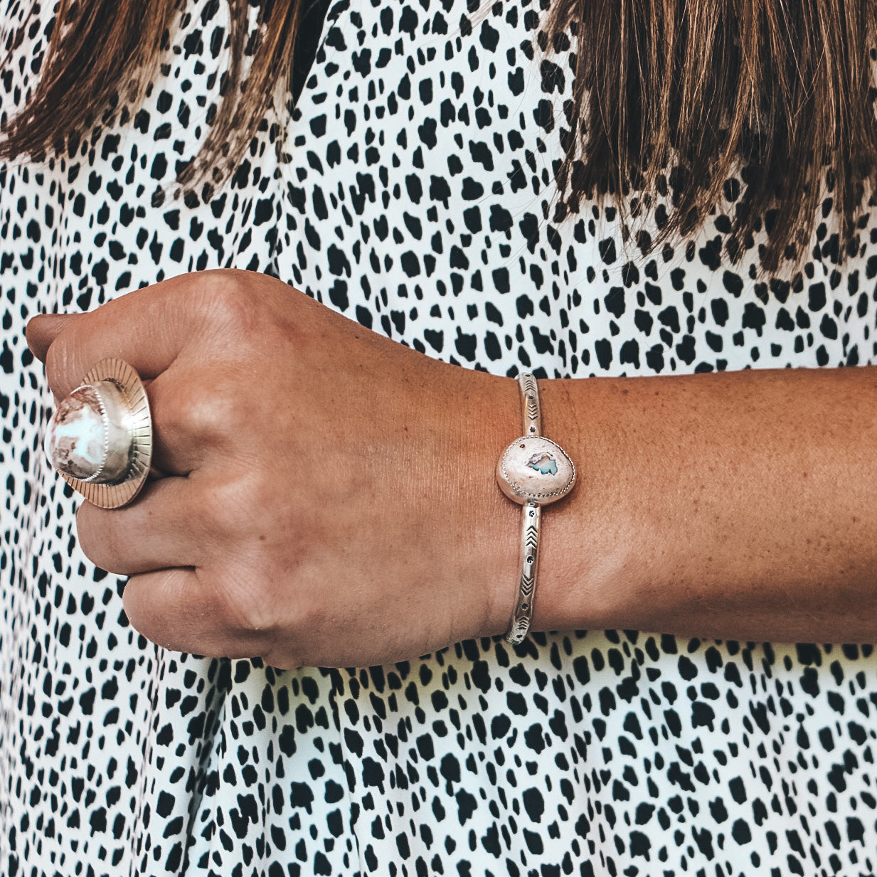 This one-of-a-kind cuff features a Mexican Opal with a sandy brown matrix and a central pocket of glittering opal fire, which flashes red and green. This cuff is made from sterling silver and fine silver, and features a hand-stamped band.