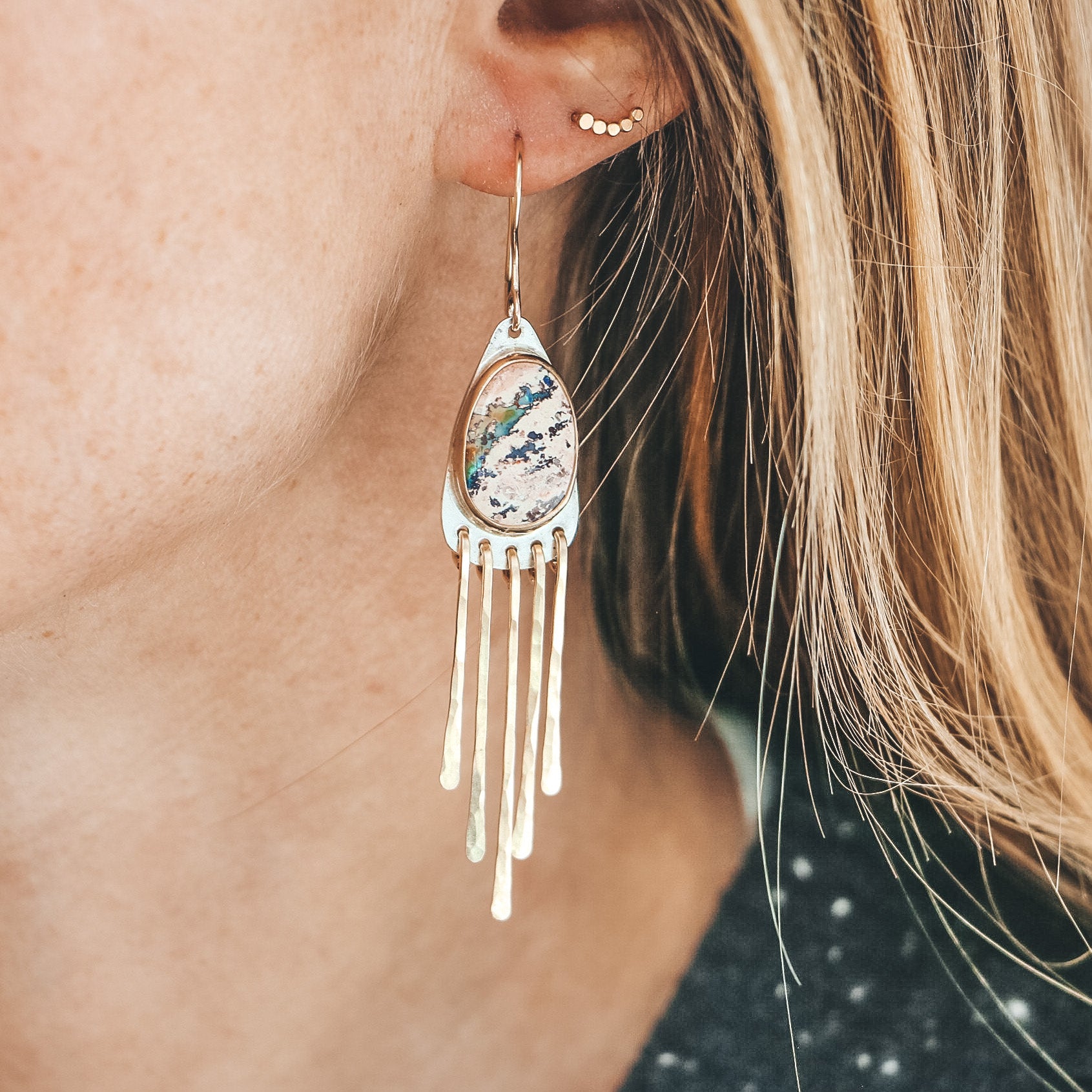 These lightweight earrings measure 3.25" in length and are set in sterling silver with a 14k gold filled bezel, fringe, and earwires.