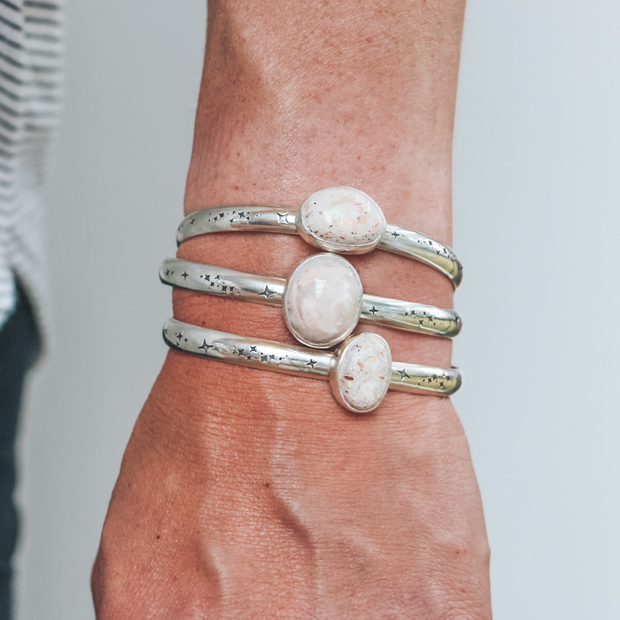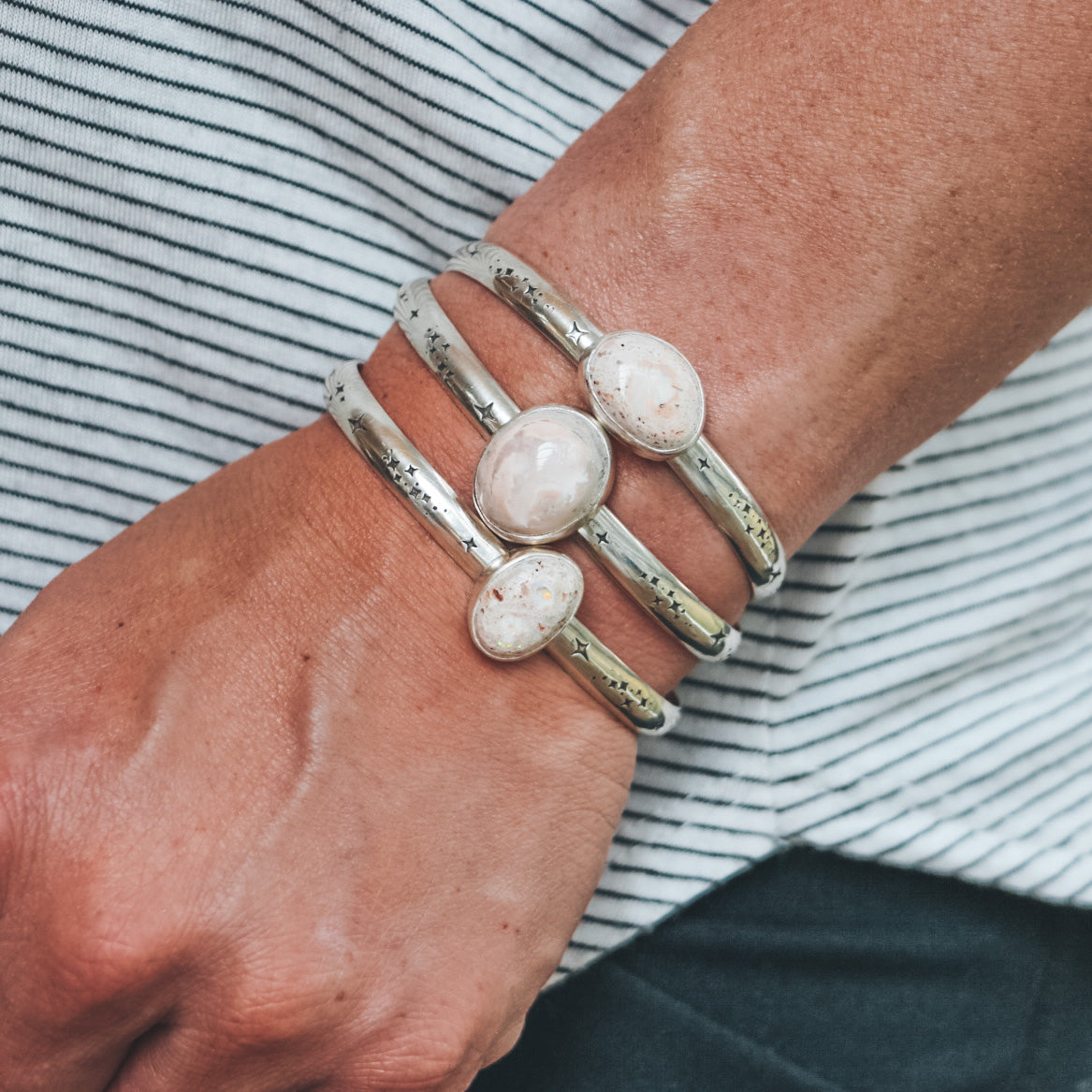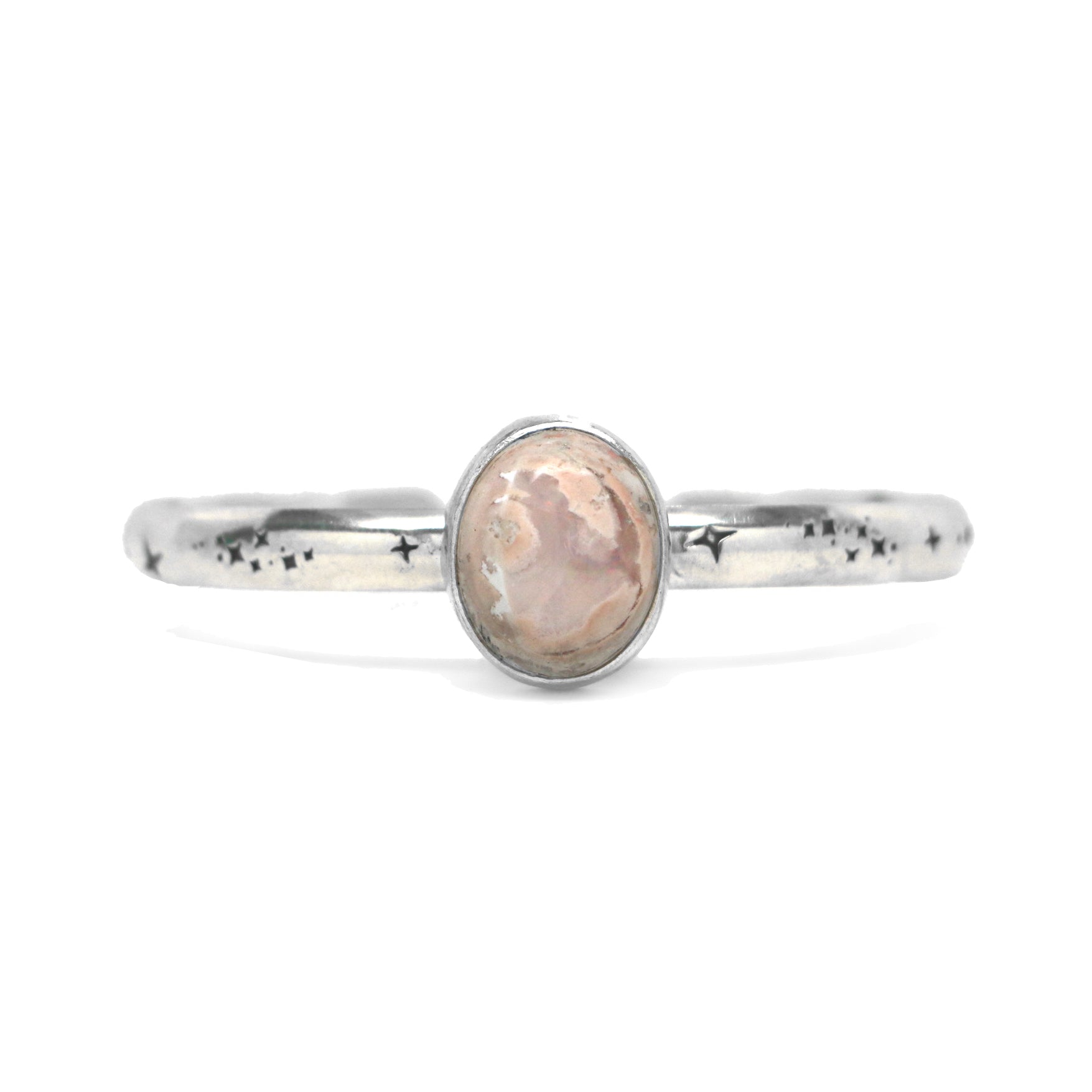 This one-of-a-kind cuff features a Mexican Opal with a sandy-peach matrix and a big central pool of glittering opal fire. This cuff is made from sterling silver and fine silver, and features a hand-stamped band with a celestial pattern. The centerpiece measures 16mm wide by 19mm tall.