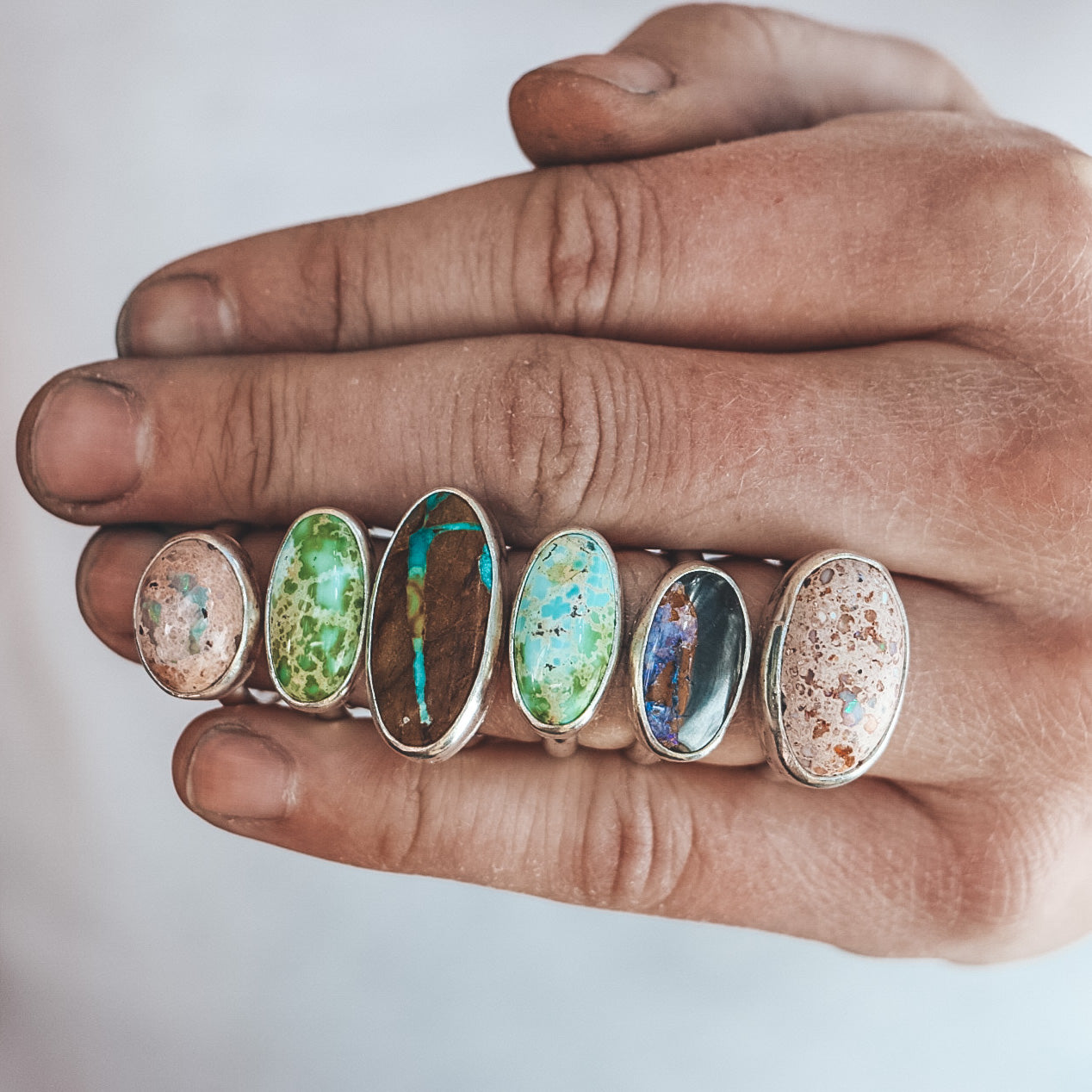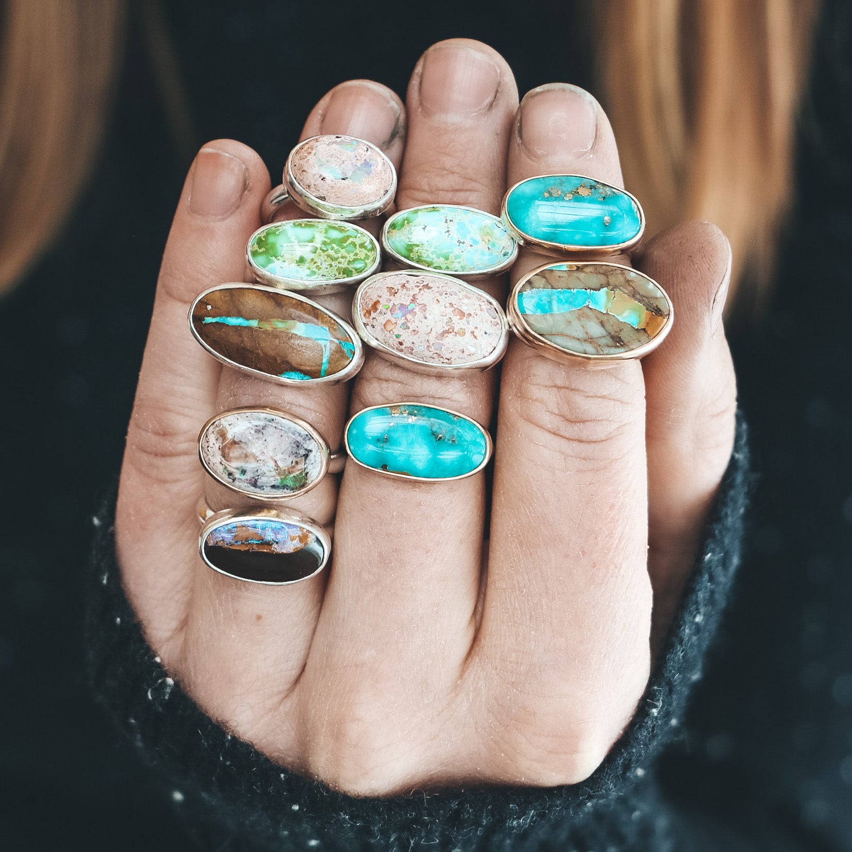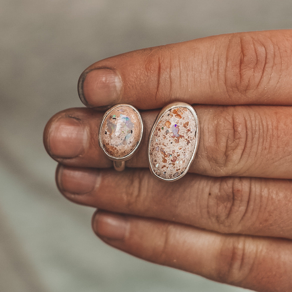 This horizontal Latitude ring features a Mexican Opal in peachy sandy hues, with flashes of blue and green opal fire.