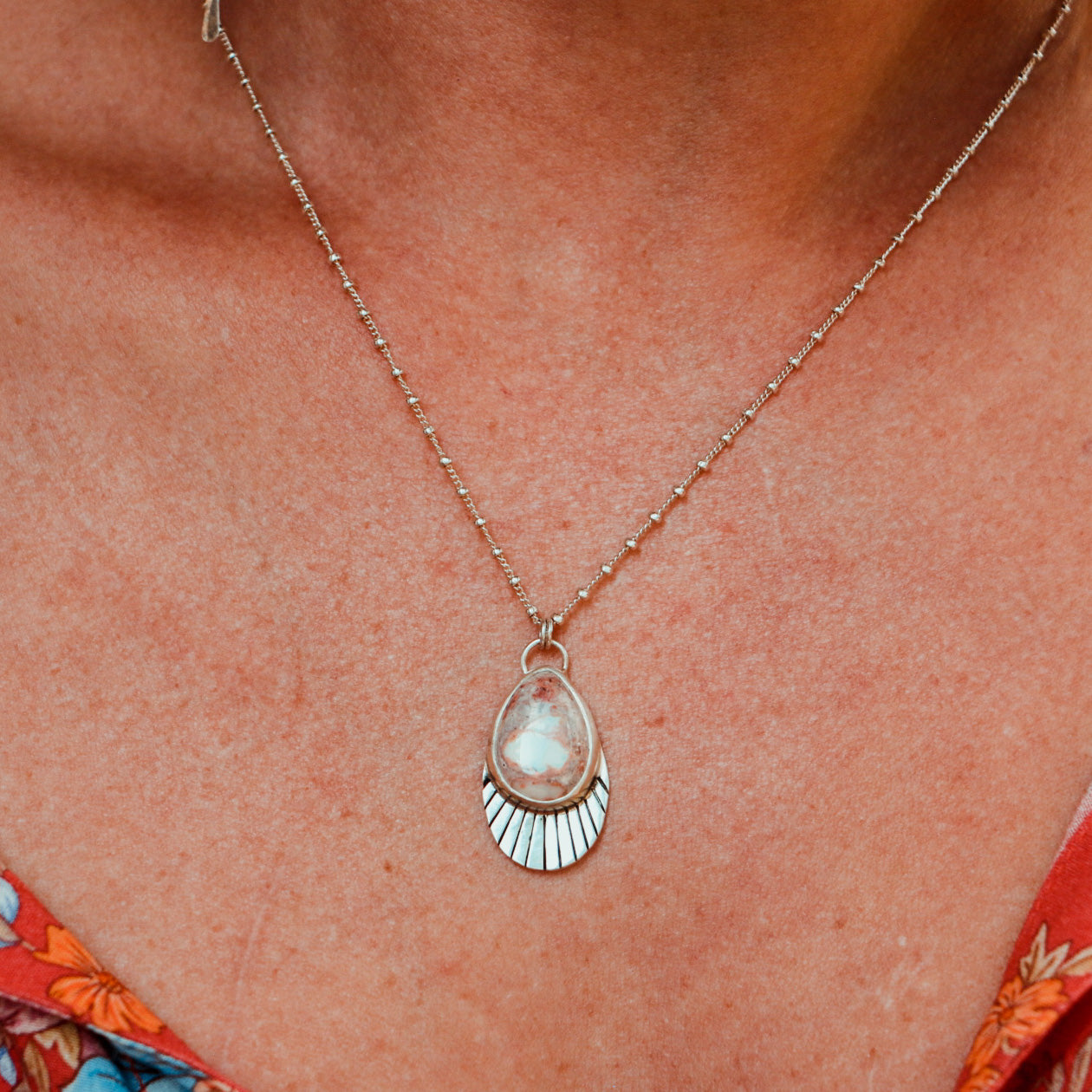 This necklace features a Mexican Opal set in sterling silver and fine silver. The pendant measures 23mm tall by 12mm wide (including the bail).