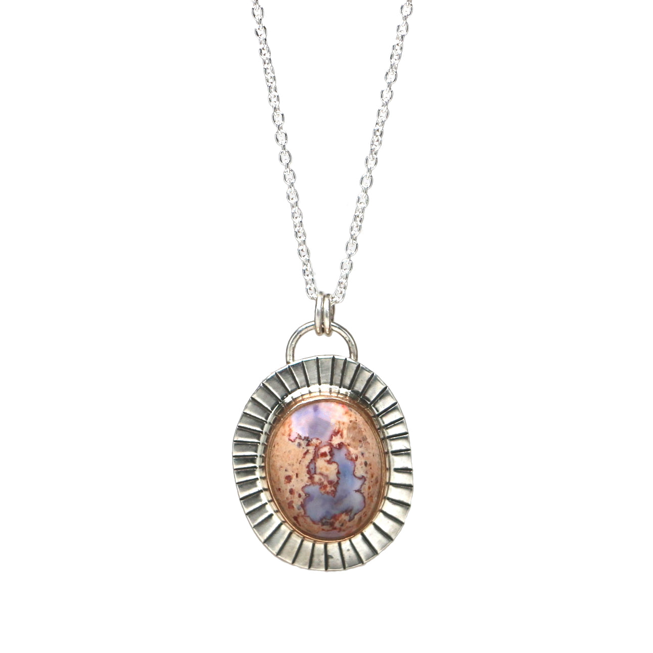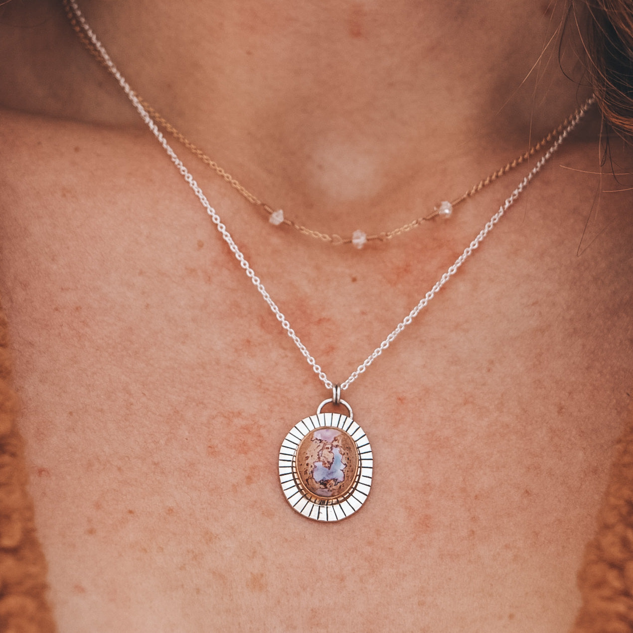 This mixed metal necklace features a Mexican Opal set in a 14k gold filled bezel with a hand-stamped sterling silver backplate. The stone is sandy-orange in color, with translucent pockets of milky purple. In natural light, this stone glitters with flecks of red opal fire. The pendant measures 16mm wide by 23mm tall, including the silver bail.