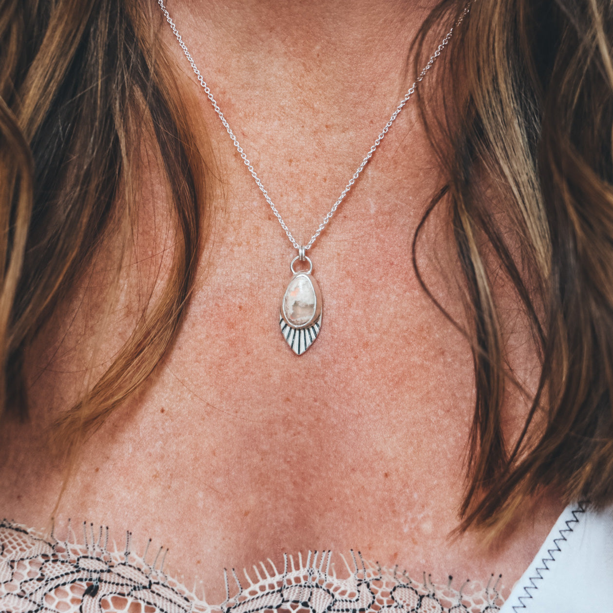 This necklace features a Mexican Opal in sandy tan with multiple glittering pockets of red, orange, and yellow opal fire. The stone is set in sterling silver and fine silver and features a hand-stamped sterling silver backplate. The pendant measures 10mm wide by 26mm tall, including the silver bail.