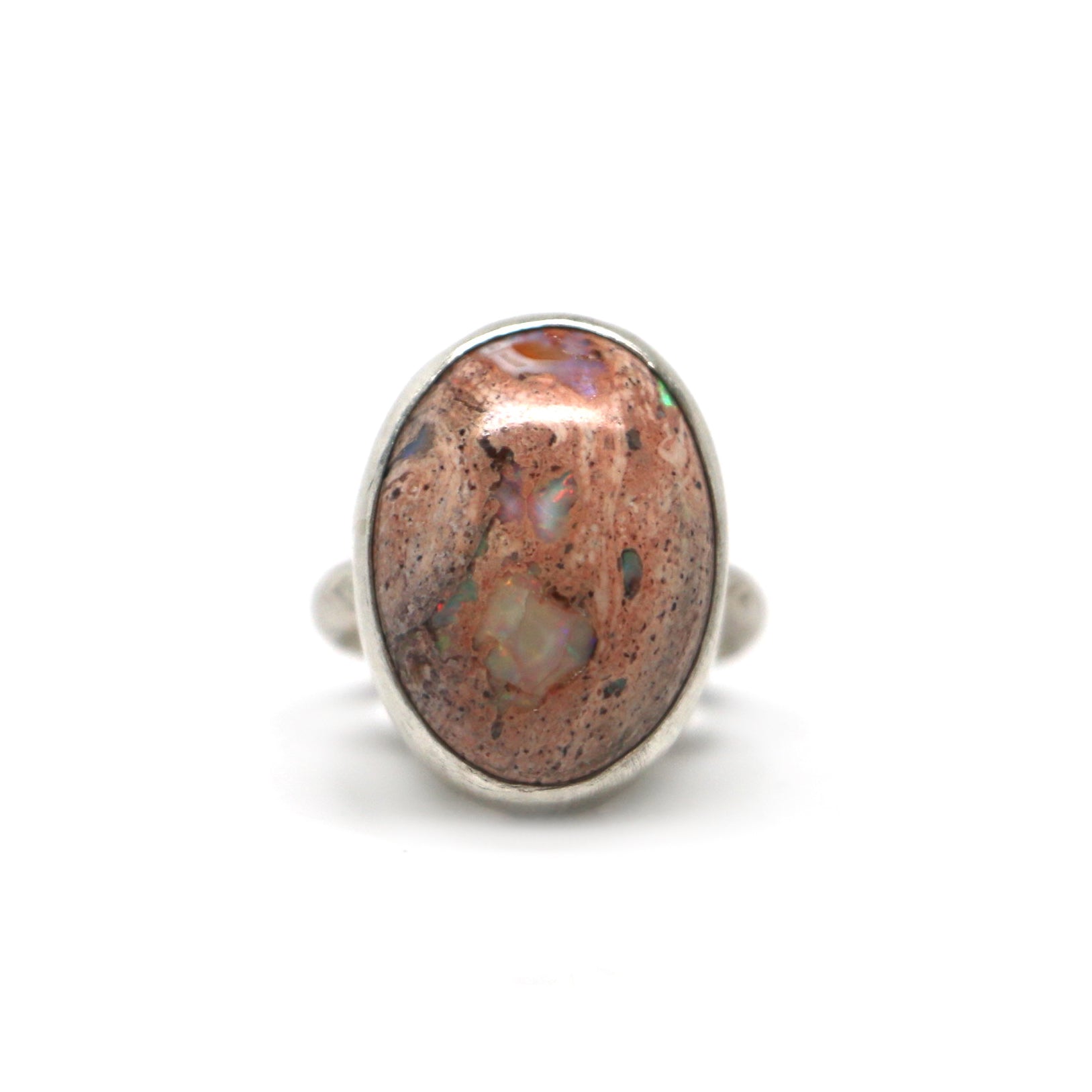 This sparkling Mexican opal has flashes of green and red opal fire. The stone measures 3/4" tall and is set in sterling silver and has a textured band.