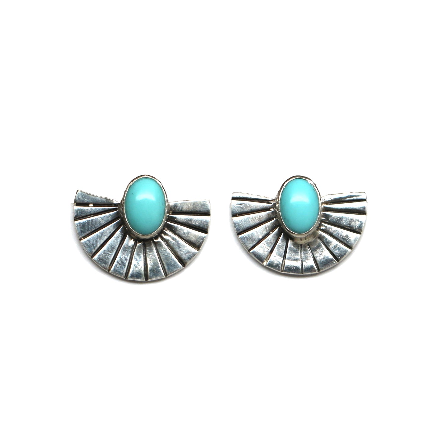 This pair features Mexican Turquoise set in sterling silver and fine silver, with Mineral + Mine's signature precise hand-stamped fan pattern.