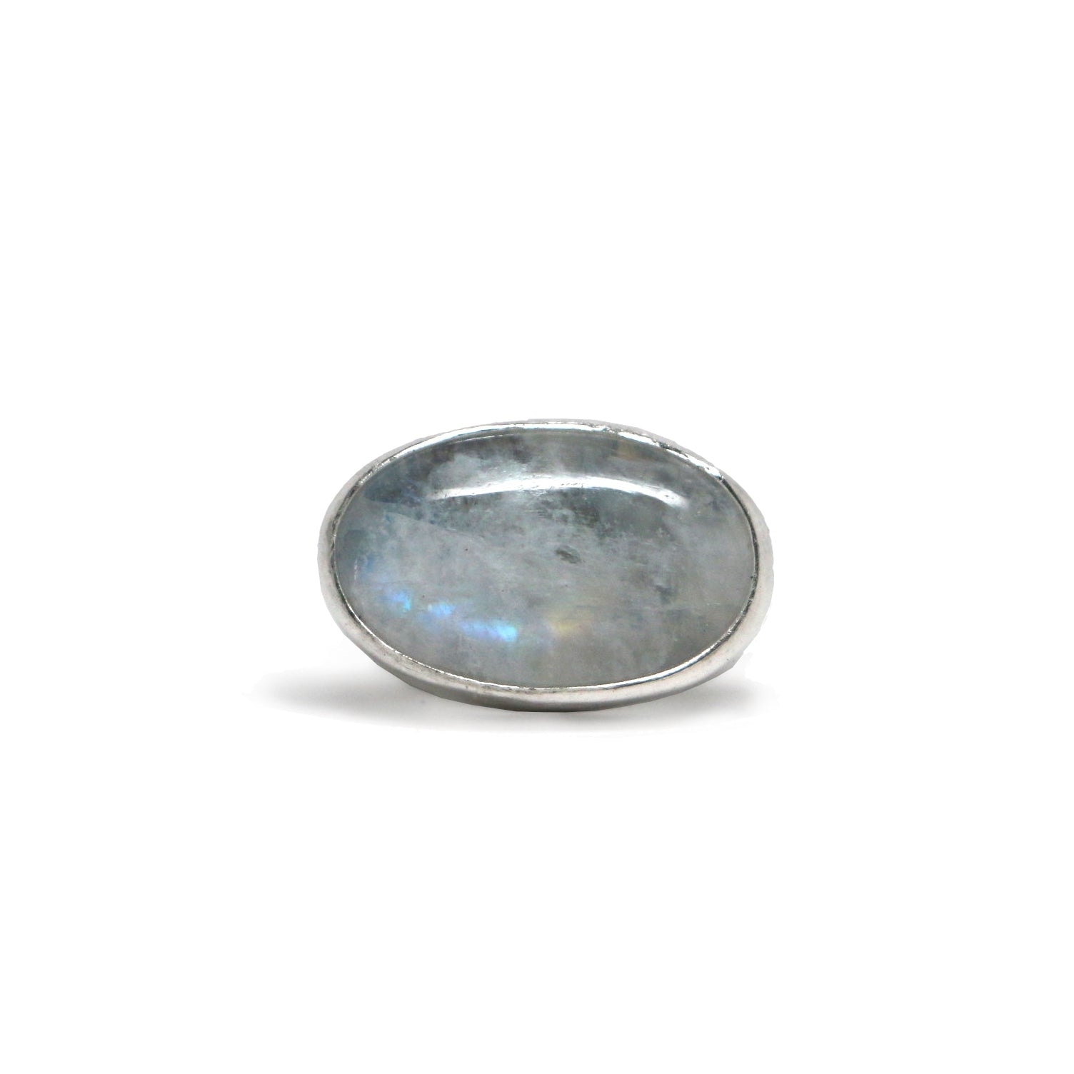 This horizontal Latitude ring features an iridescent moonstone with rainbow flash.