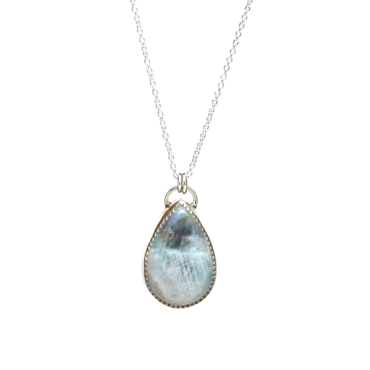 This simple necklace features a luminous moonstone set sterling silver and fine silver, with a serrated bezel. The stone has rainbow flashes especially in natural light (see video).