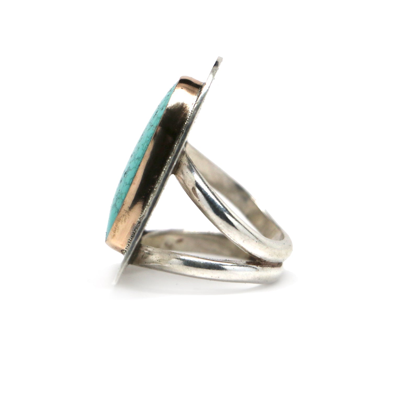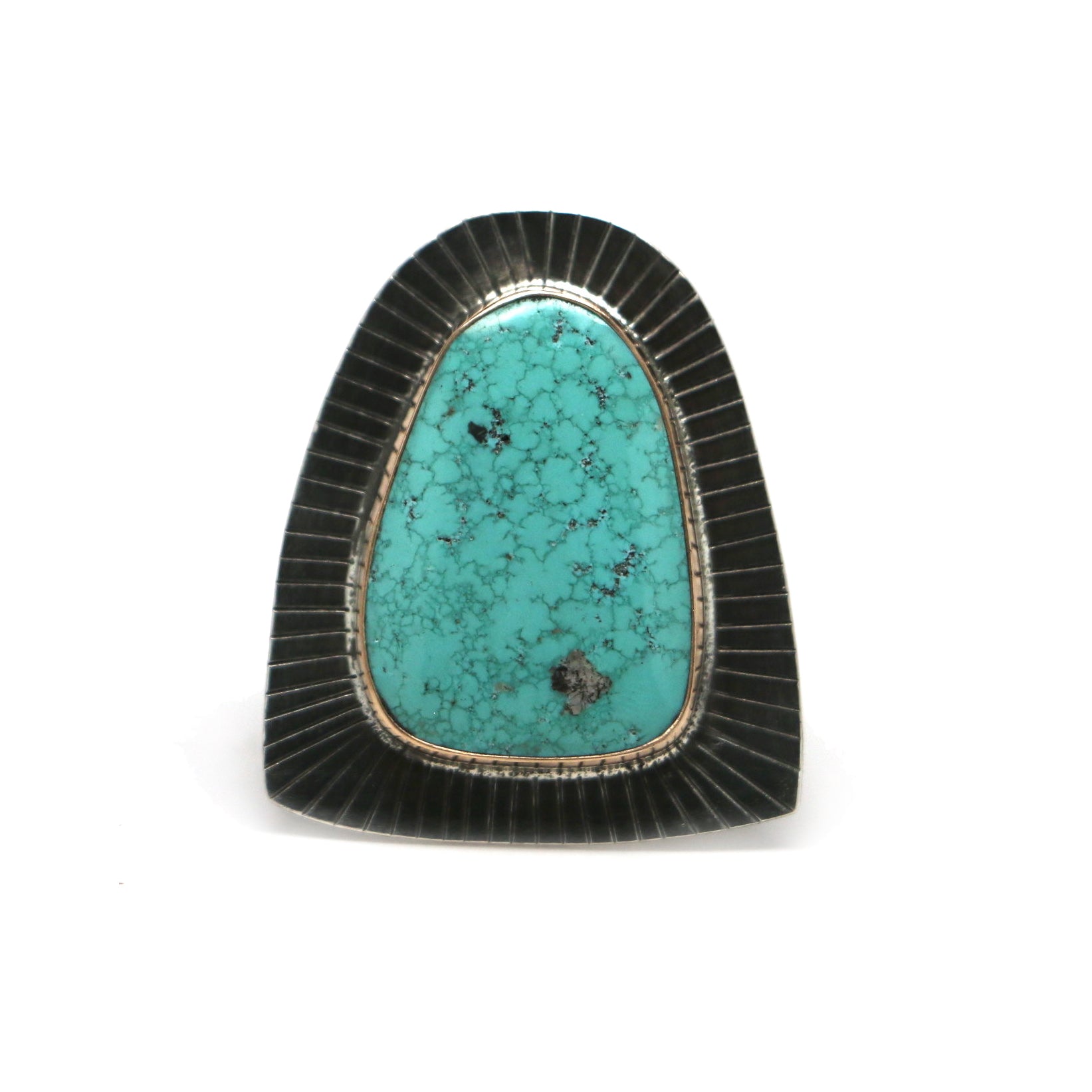 This statement ring features a Morenci turquoise stone in light teal with light grey veins. This mixed-metal piece has a 14k gold fill bezel and sterling silver backplate, which is hand-stamped with a radiating lines pattern.
