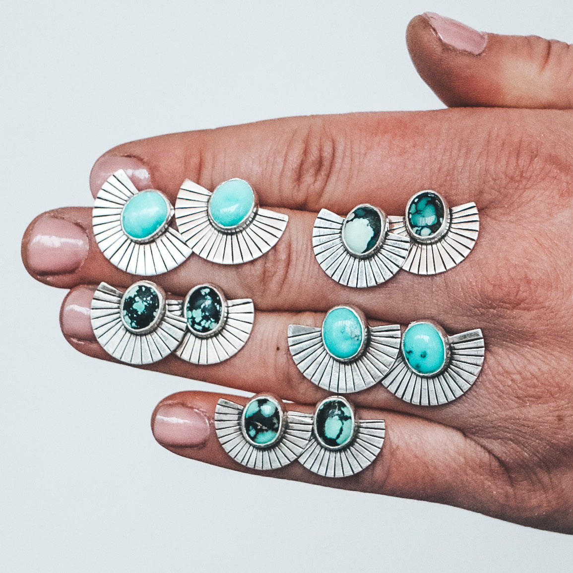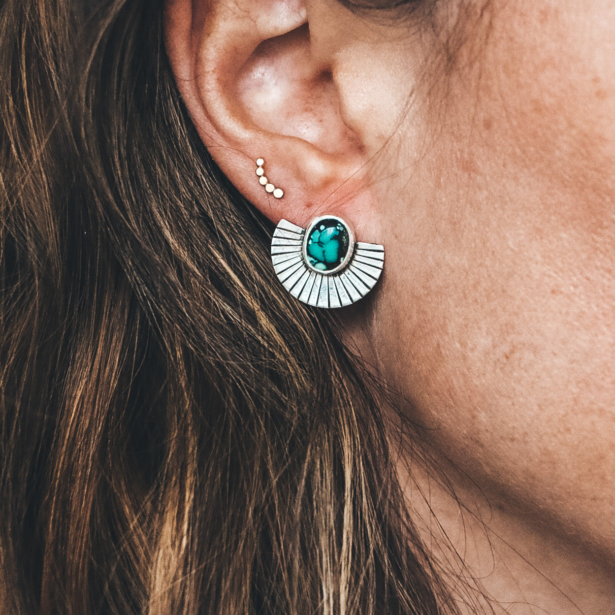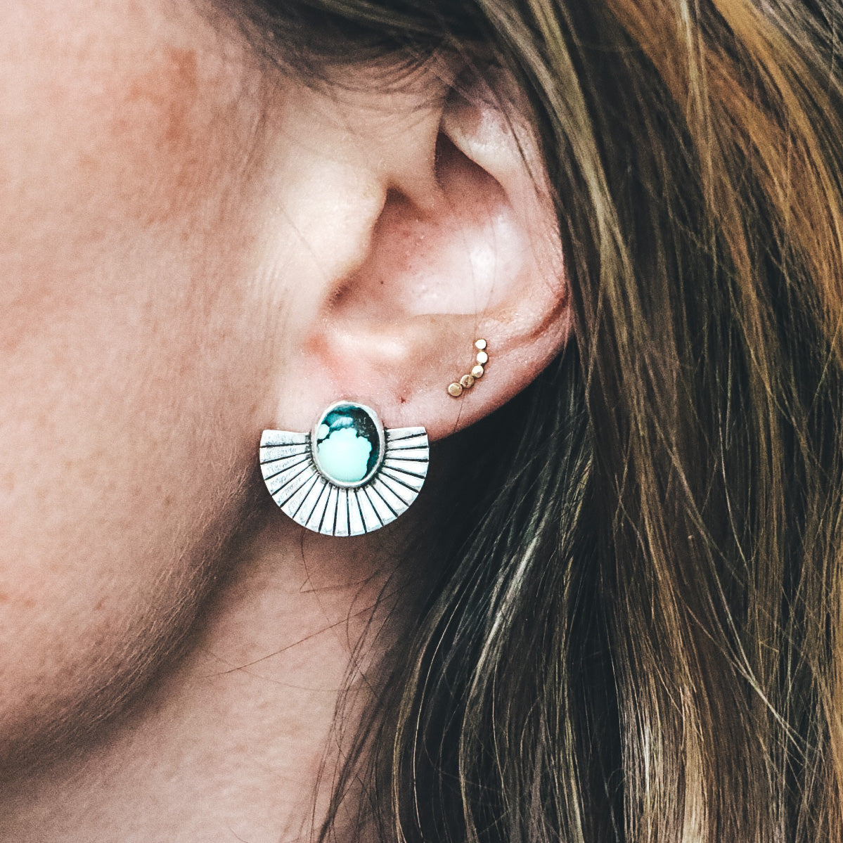 The Fan Studs have become a signature design and customer fave of Mineral + Mine! Each pair of Fan Studs features a precise straight-line fan pattern and unique one-of-a-kind stones.