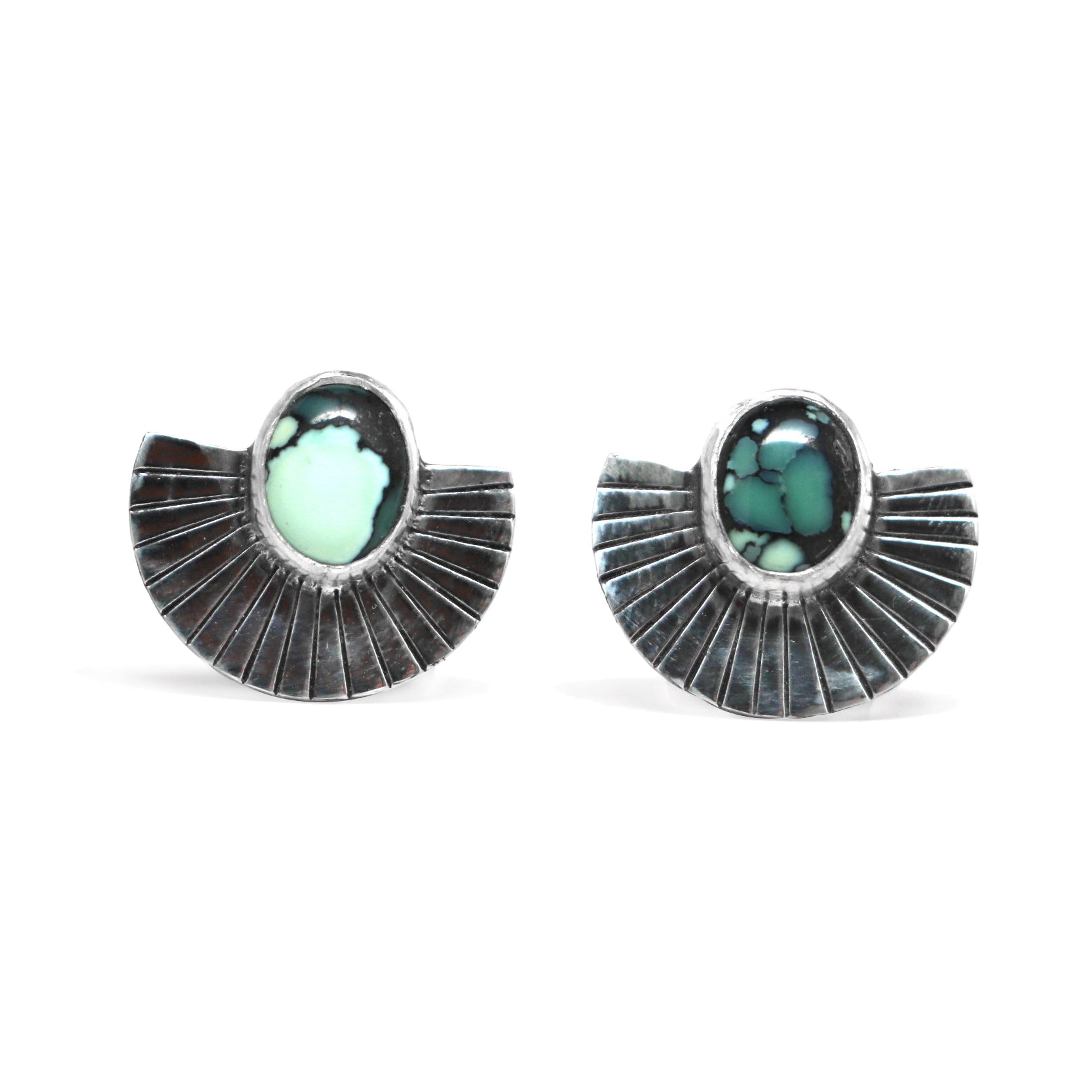 This pair of Fan Studs is set with New Lander turquoise, which varies from light green to black.