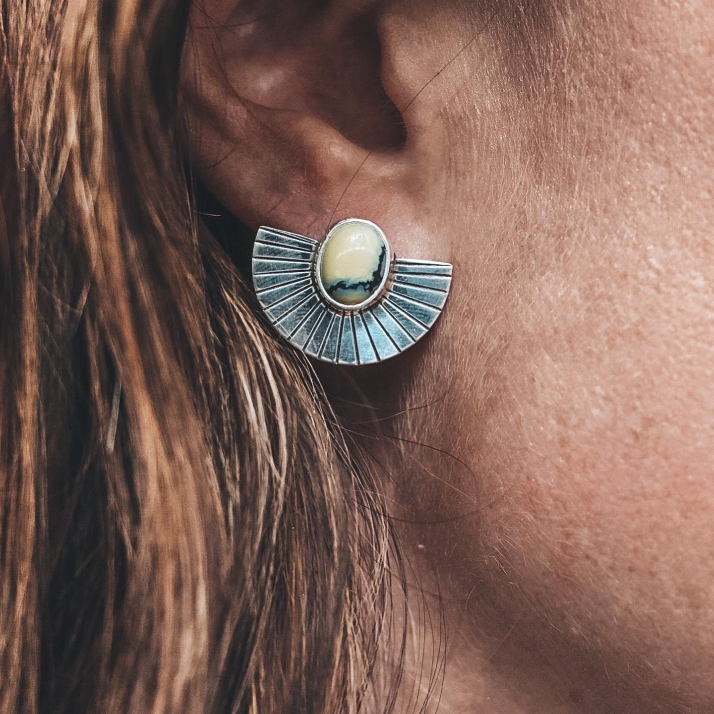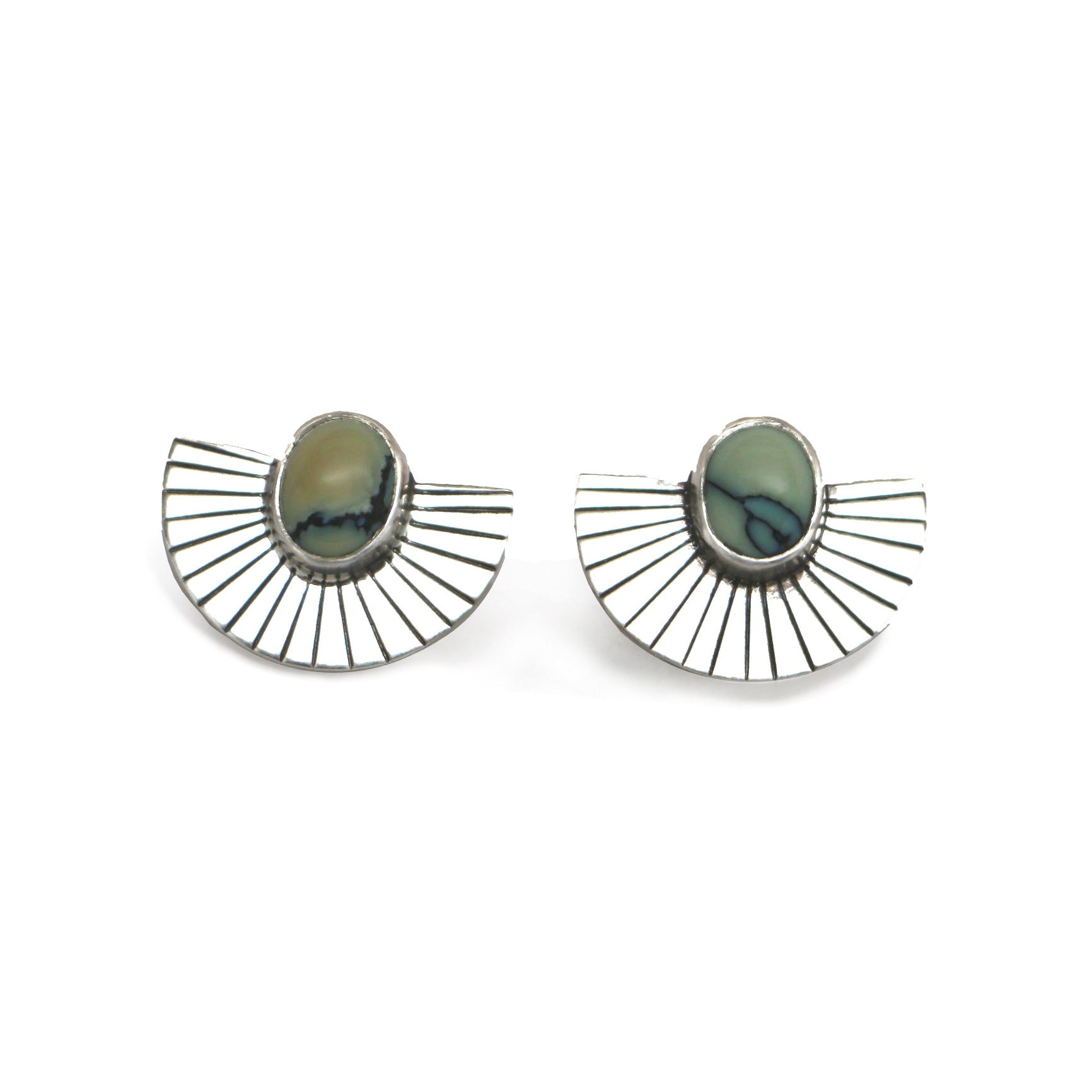 The Fan Studs have become a signature design and customer fave of Mineral + Mine! Each pair of Fan Studs features a precise fan pattern and unique one-of-a-kind stones. This pair of Fan Studs is set with New Lander turquoise, which varies from green to ochre-yellow, with black veining.