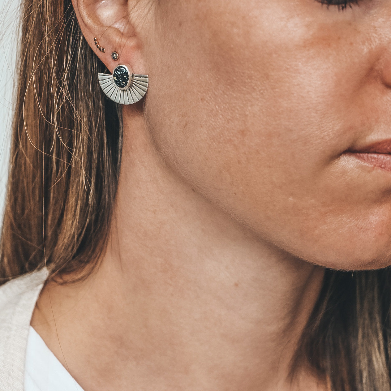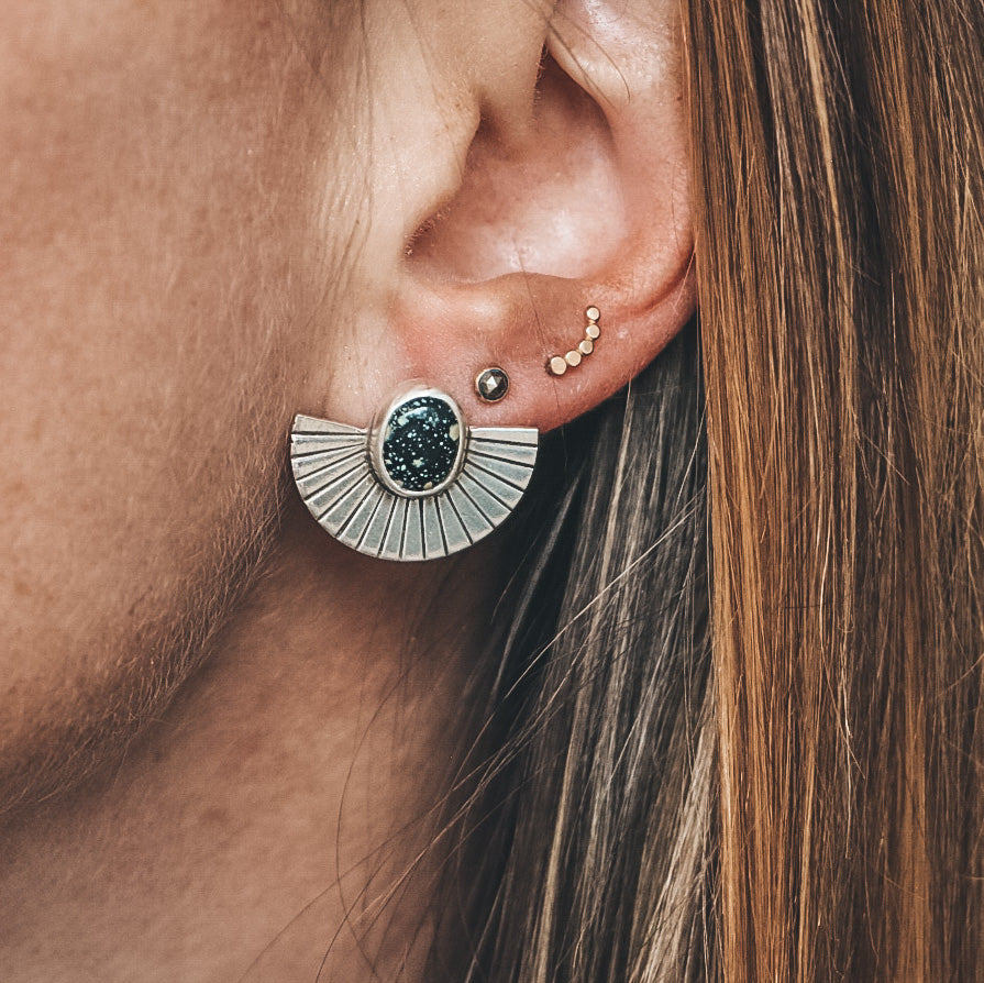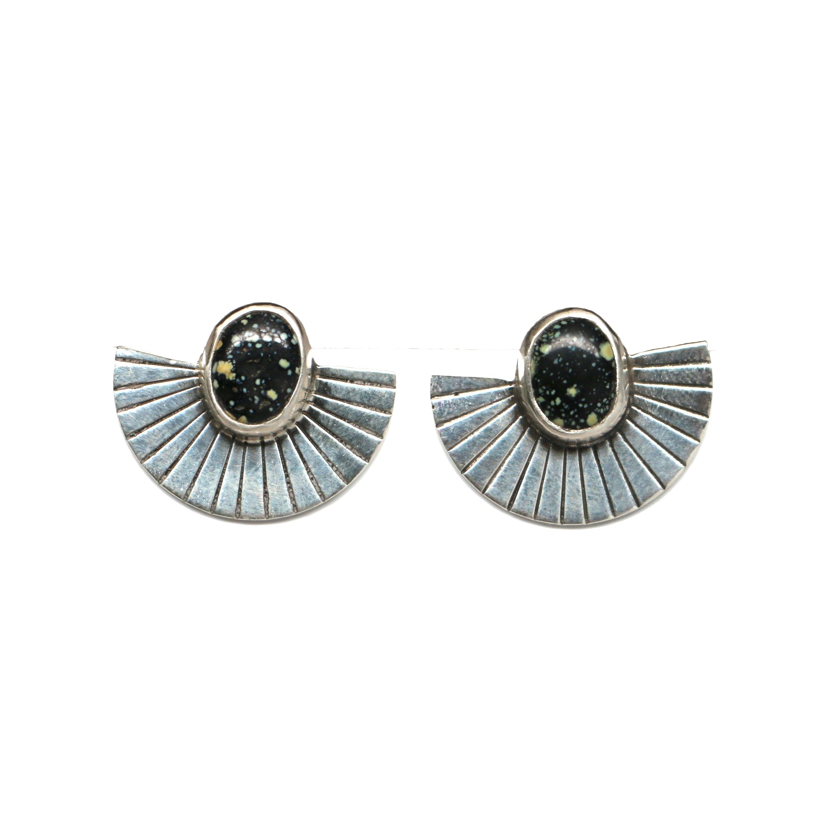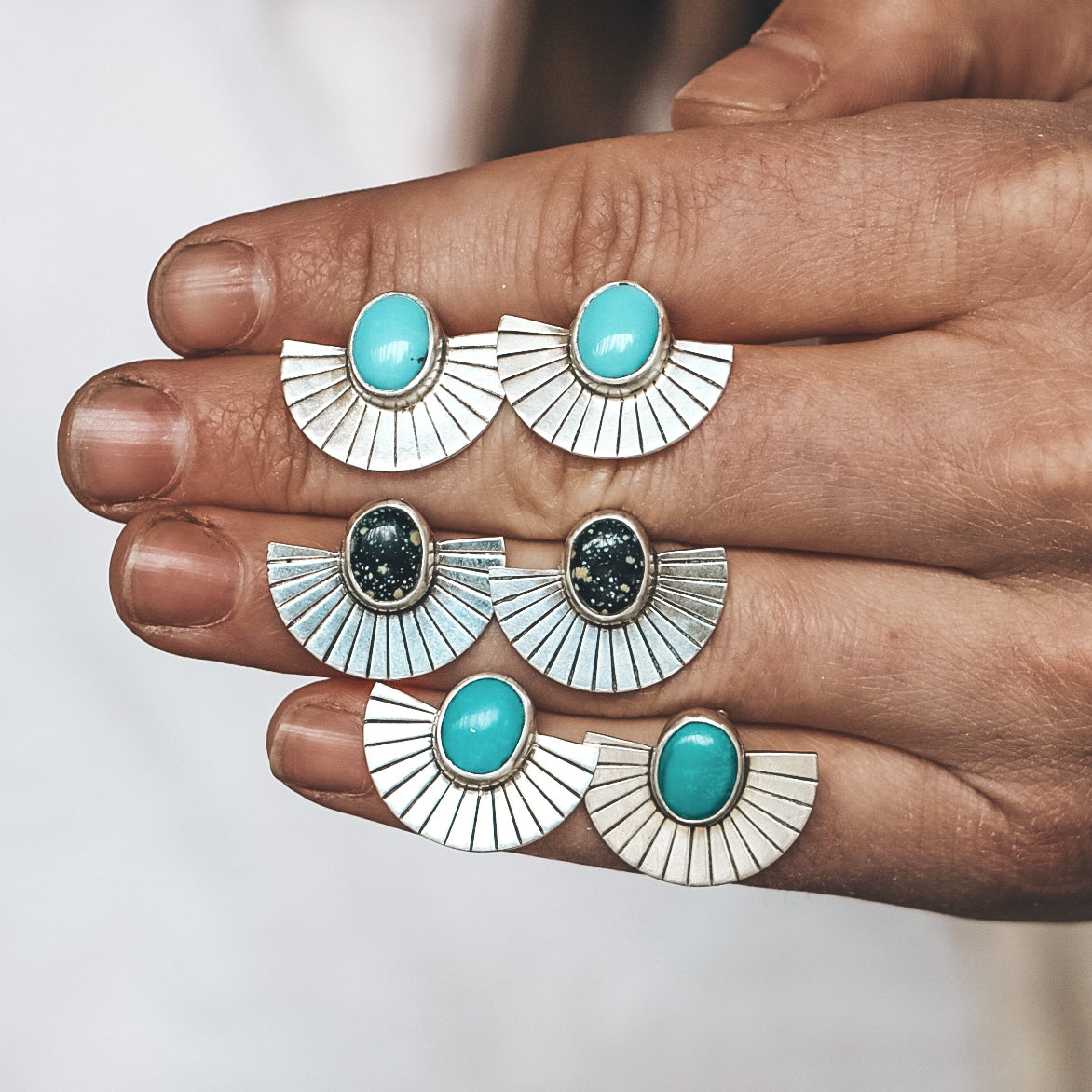 The Fan Studs have become a signature design and customer fave of Mineral + Mine! Each pair of Fan Studs features a precise fan pattern and unique one-of-a-kind stones. This pair of Fan Studs is set with New Lander turquoise, which is mostly black with speckles of yellow and green.