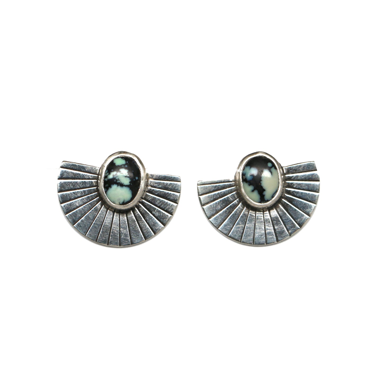 This pair of Fan Studs is set with New Lander turquoise, mined in the USA. These stones are a mix of yellowy-green and black veins.