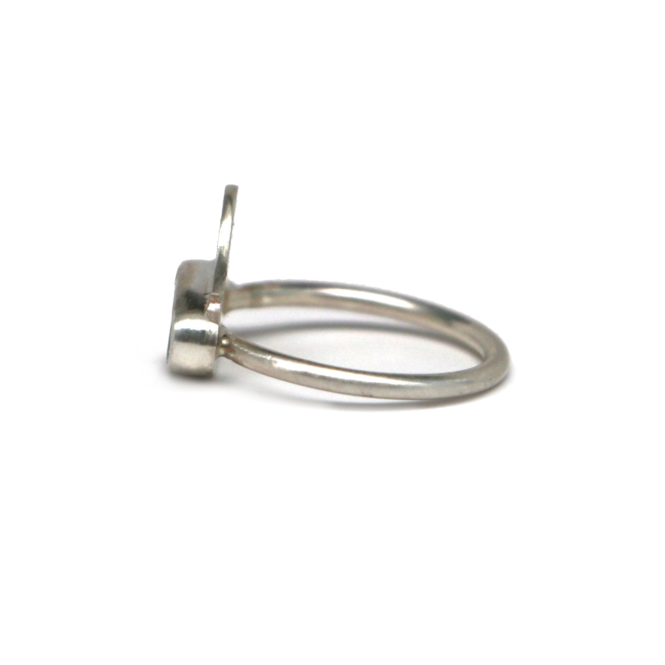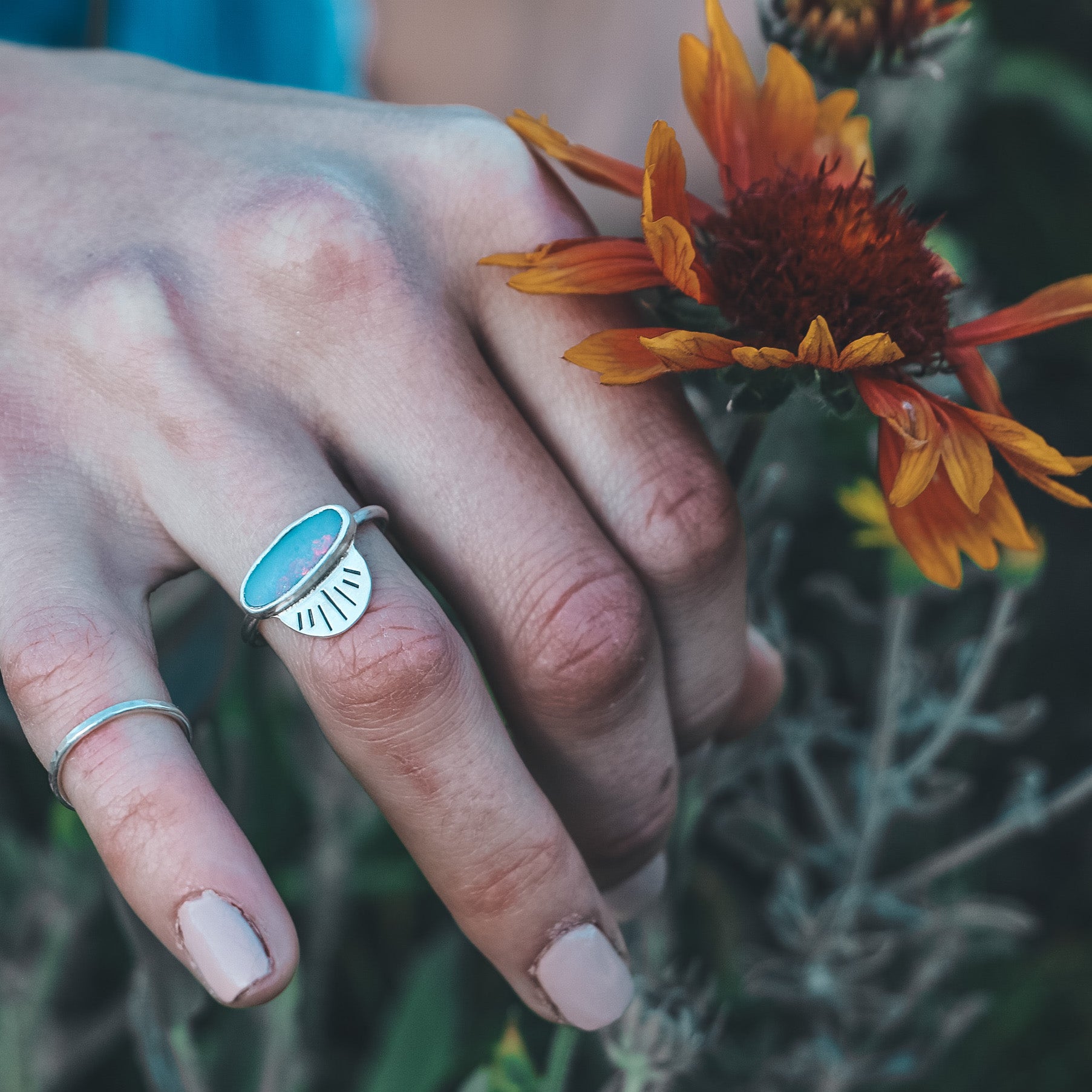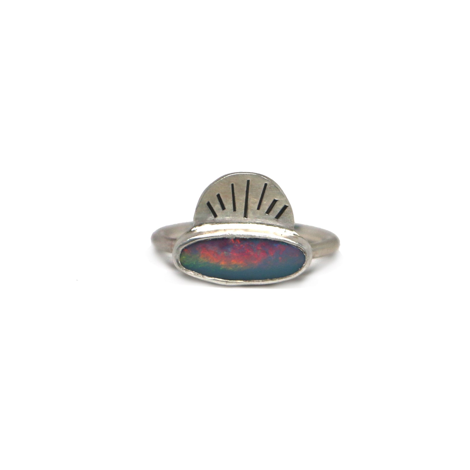 This dainty Australian blue opal ring is set in sterling silver with a fan-shaped embellishment. The stone features flashes of pink and orange opal fire.