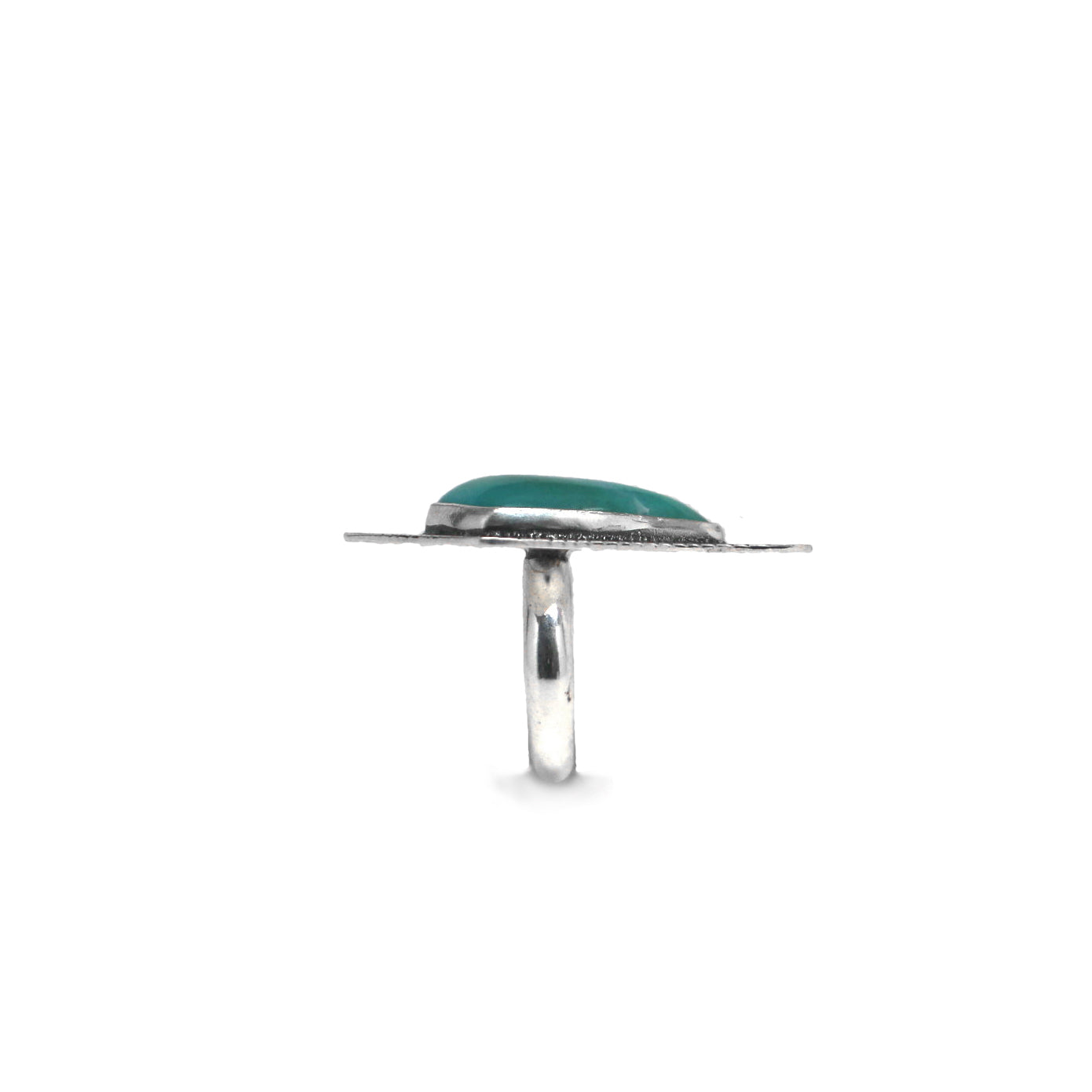 The Sunbeam design has become a Mineral + Mine signature style. This ring features Opalized Wood in bold teal, with a milky ribbon up the middle. The stone is set in sterling silver and fine silver, with a precise Sunbeam pattern surrounding the stone.