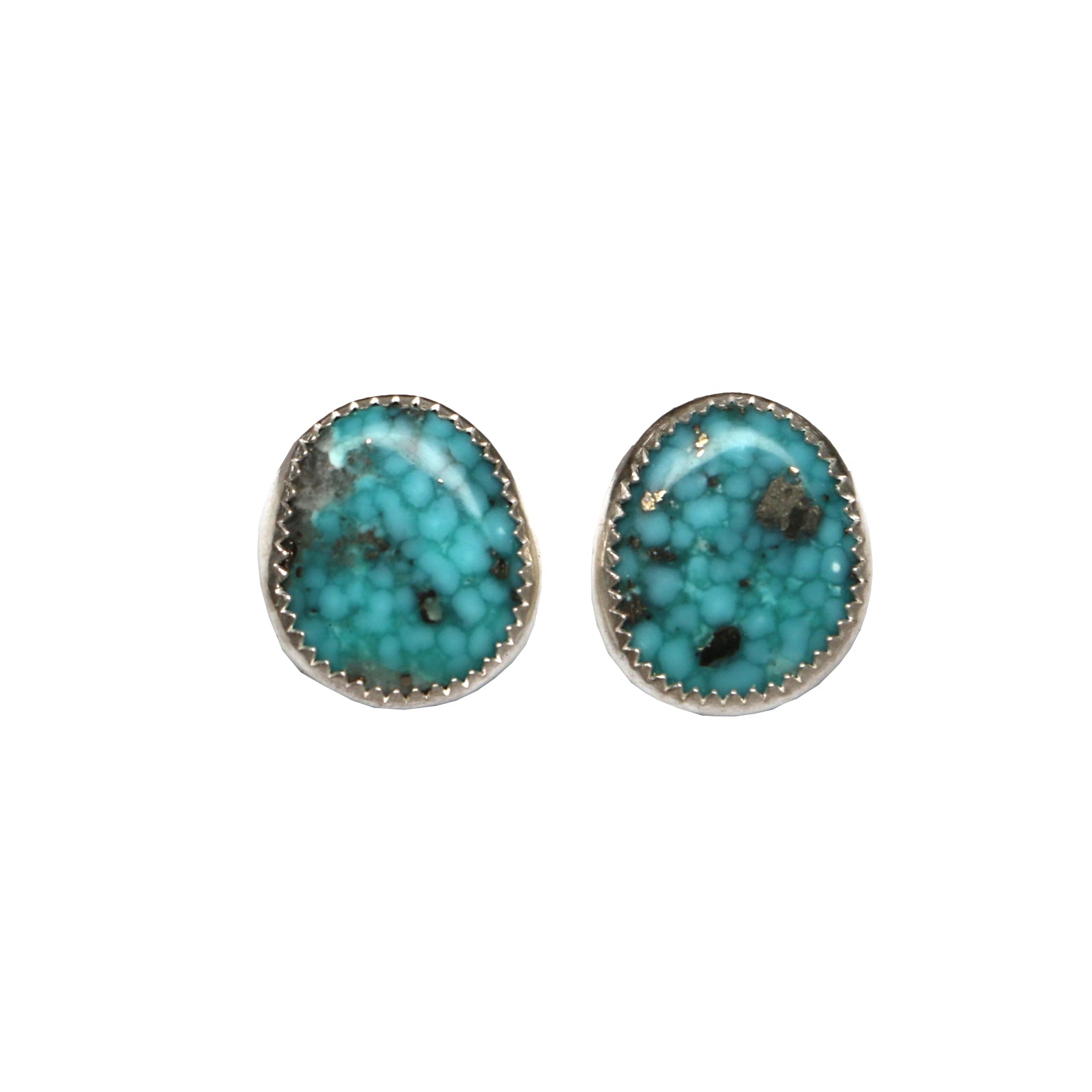 These Kingman Turquoise studs are bright teal in color with flecks of pyrite inclusions.