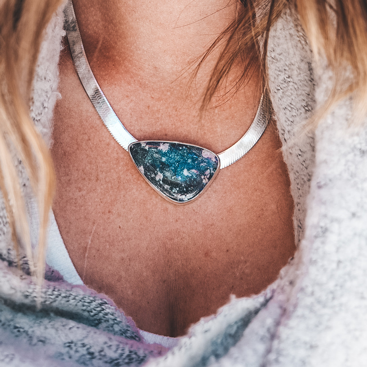This bold necklace makes a statement! Featuring an incredible 'Galaxy' Andamooka Opal from Australia, this necklace is sure to elevate any outfit.