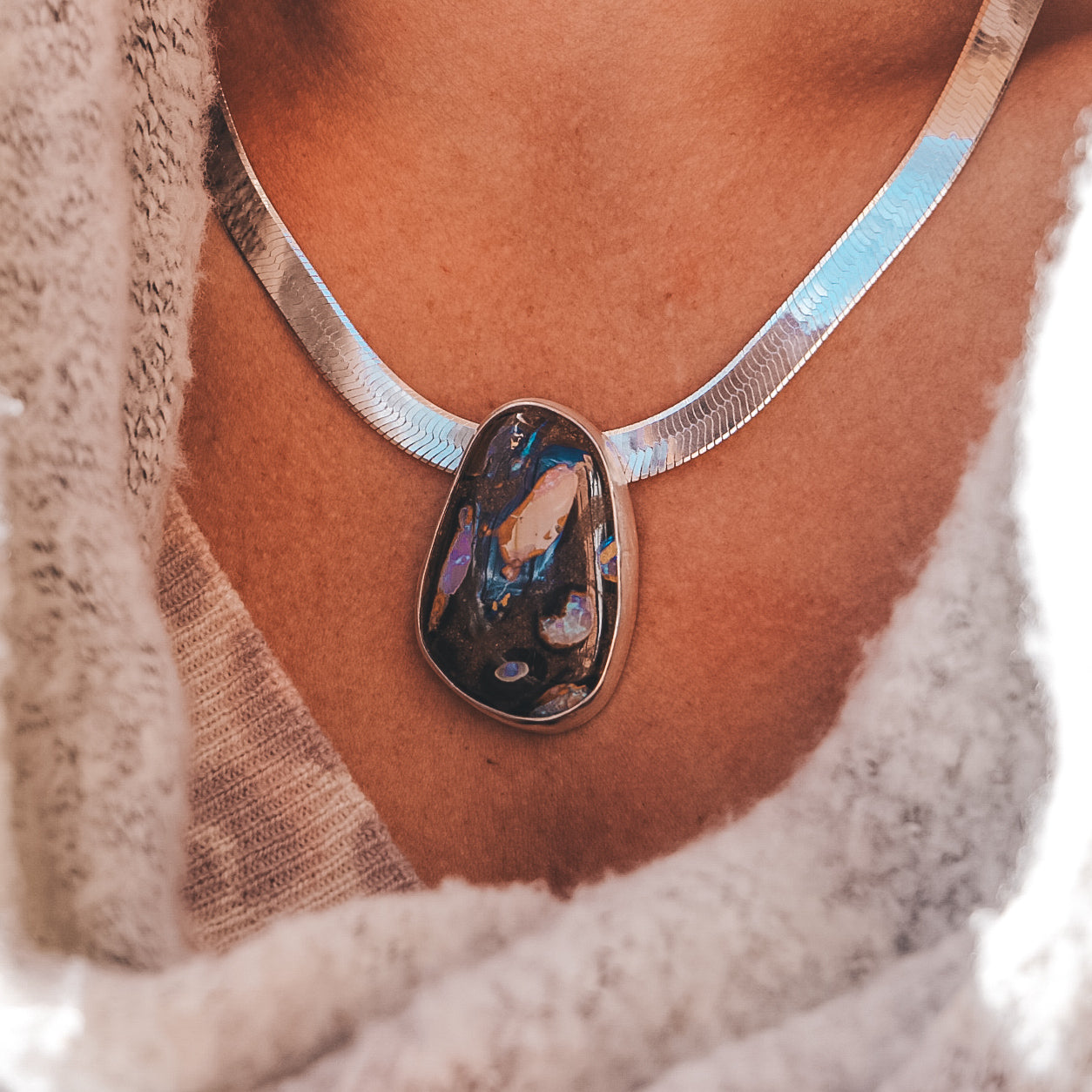 This bold necklace makes a statement! This piece features an amazing Boulder Opal with numerous pockets of fire.