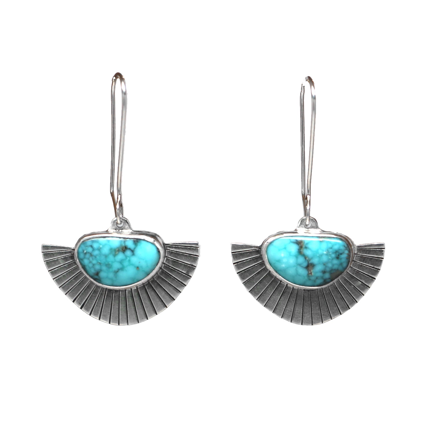 Lightweight as always, these fan earrings feature our signature straight line sunburst pattern alongside Kingman Turquoise. This pair of Kingman stones are brilliant teal with inclusions of pyrite.