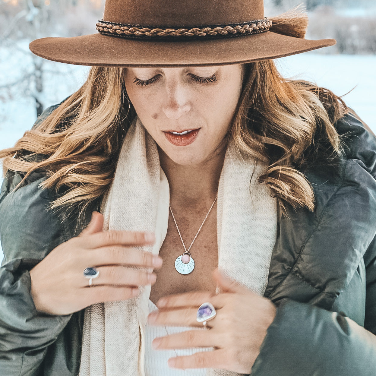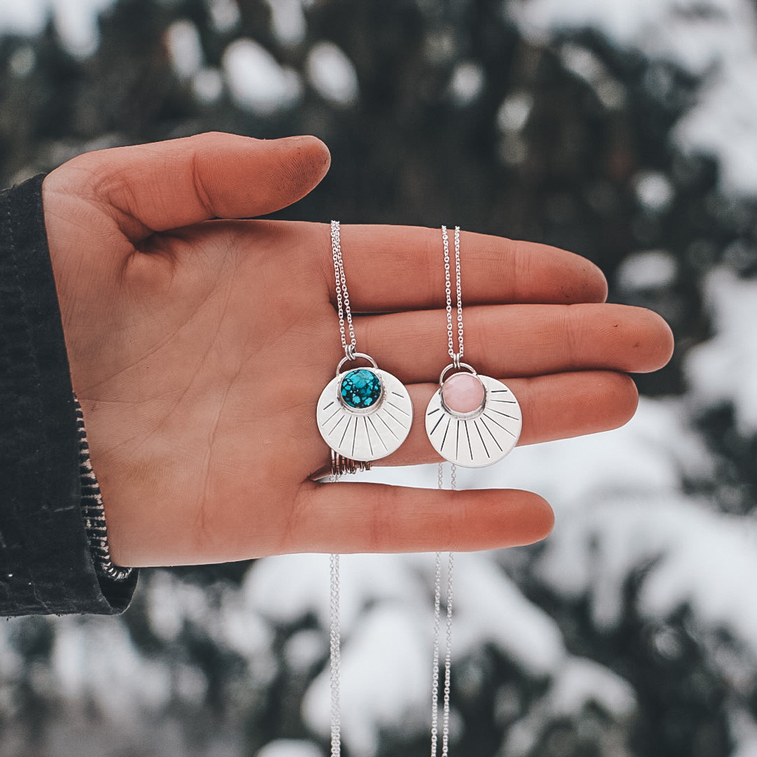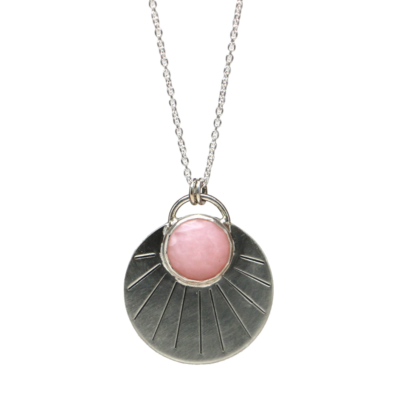 This necklace features clean lines in a sunrise pattern - a signature style of Mineral + Mine. The stone is faceted rose quartz in a milky pink hue.