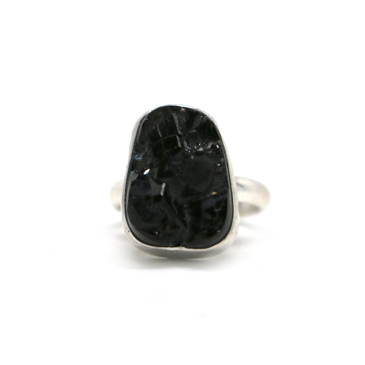 This simple ring features a rough andradite garnet stone, which has a crystalline surface texture. The stone is set in sterling silver and fine silver with a plain band.