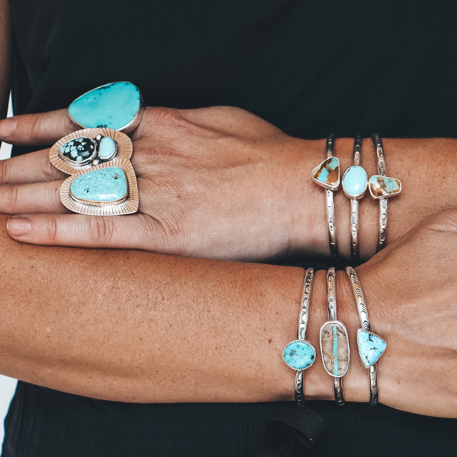 This one of a kind cuff features a horizontal Royston Ribbon Turquoise, mined in Nevada. This Royston stone, measuring approximately 14mm by 16mm, has a sandy matrix with a bright pops of teal and green. This bracelet is made from sterling silver and fine silver, and features a hand-stamped cuff.