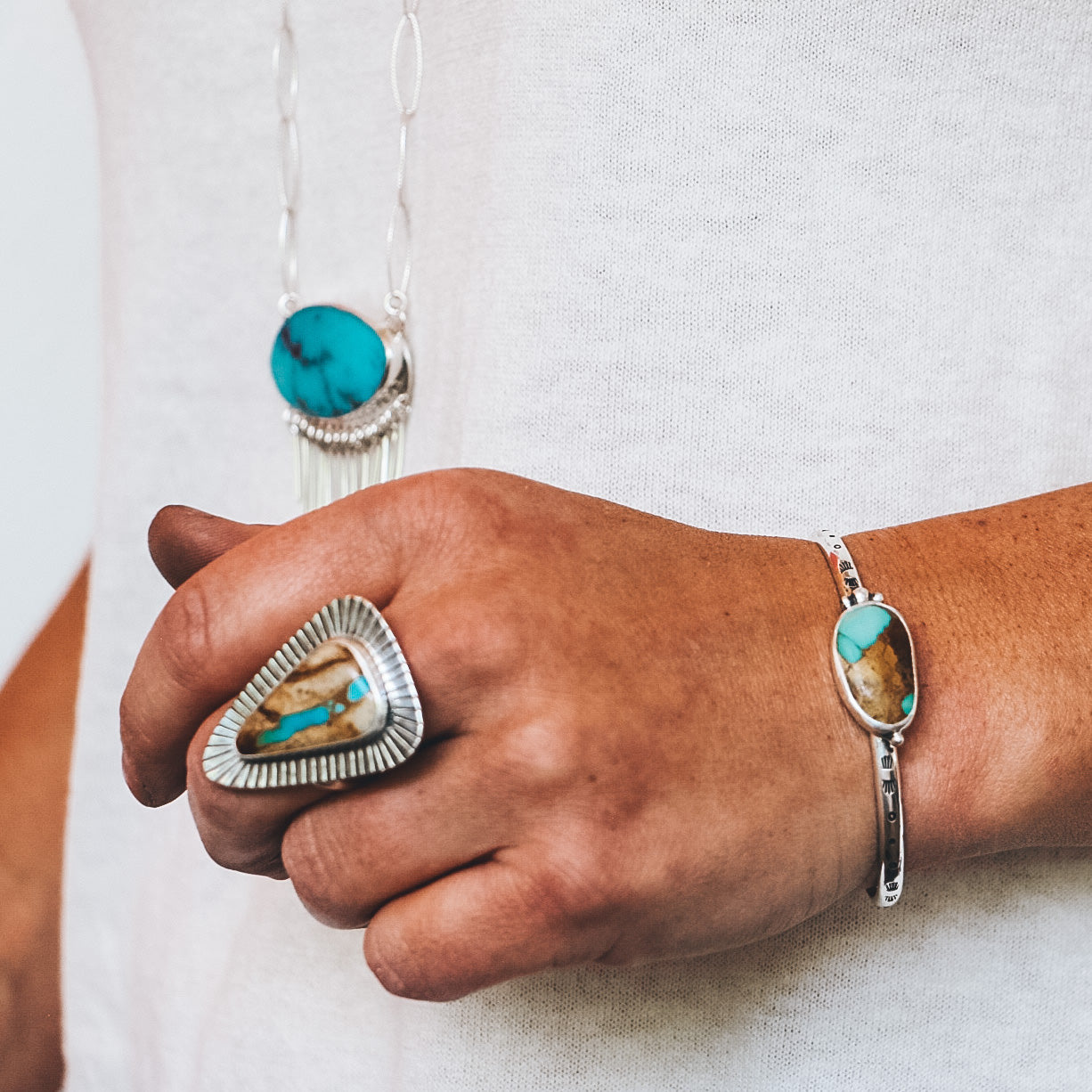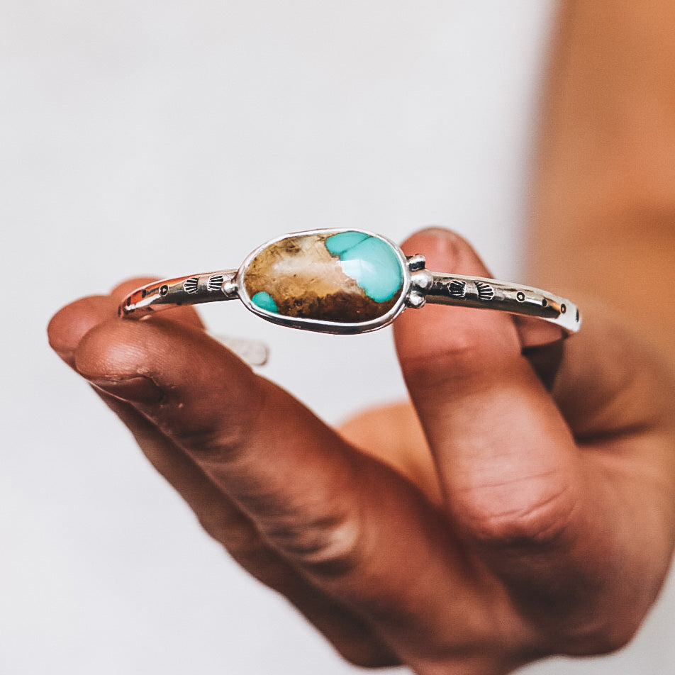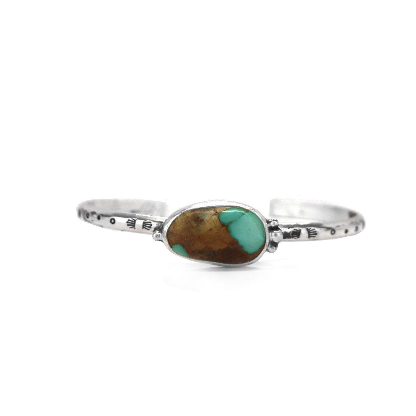 This one of a kind sterling silver cuff features a horizontally set Royston Ribbon Turquoise, mined in Nevada. This Royston stone, measuring approximately 26mm wide by 14mm tall, has a sandy matrix with a bright pops of teal-green.