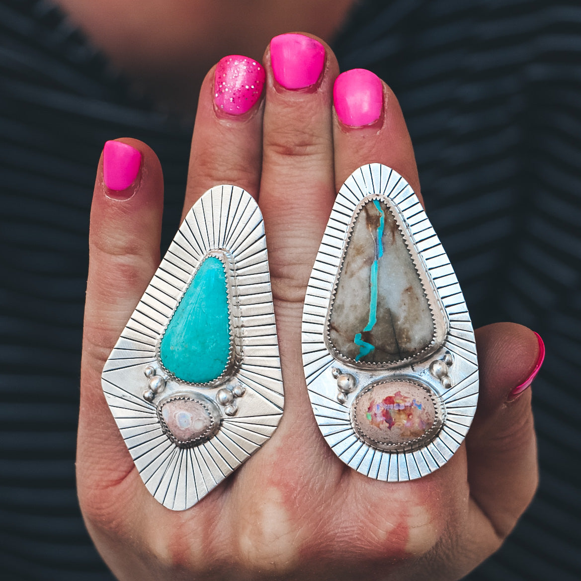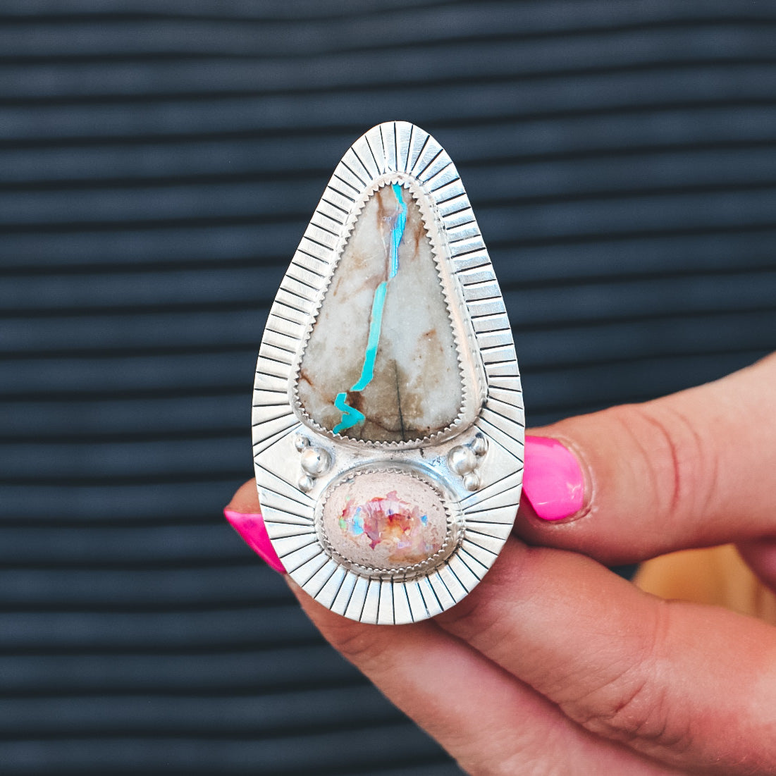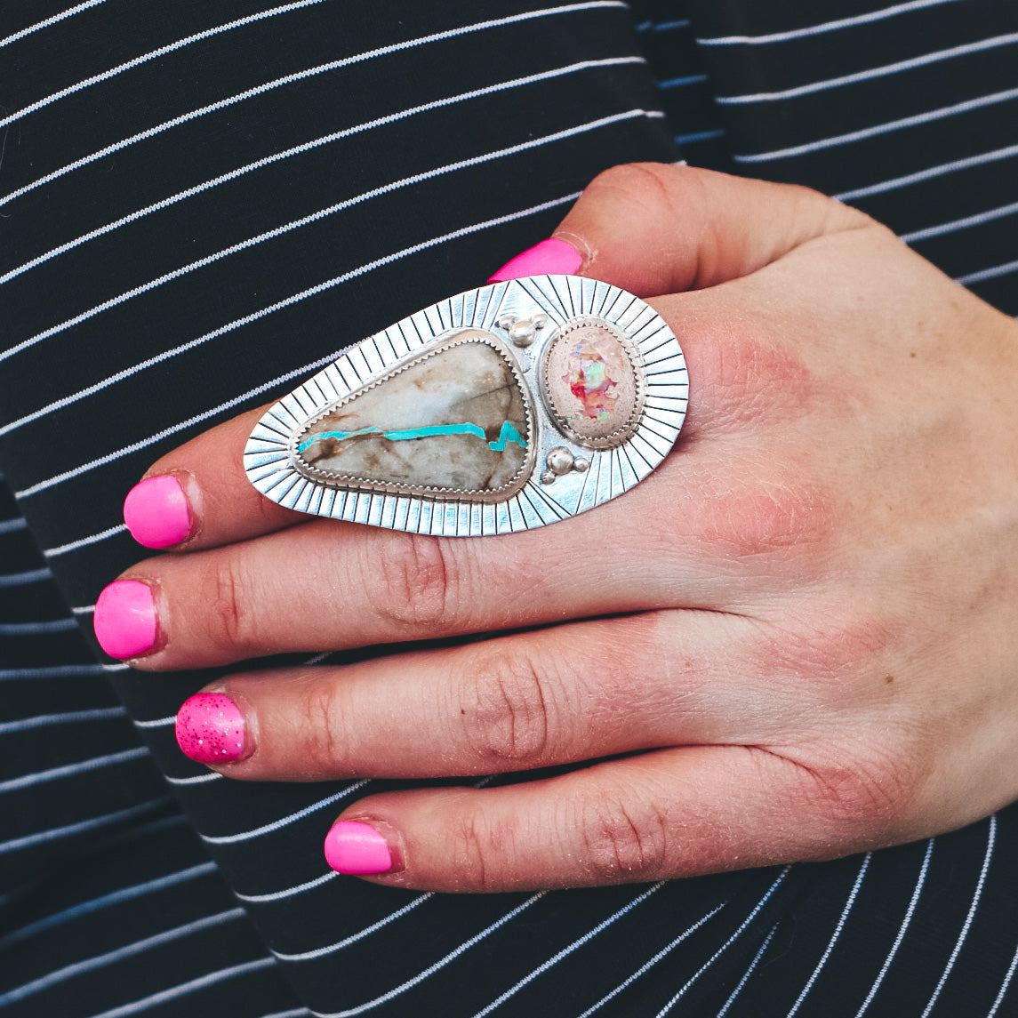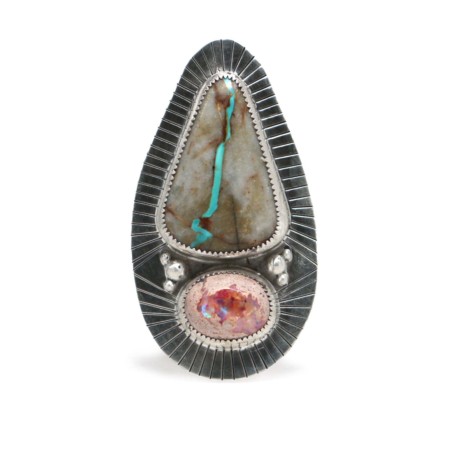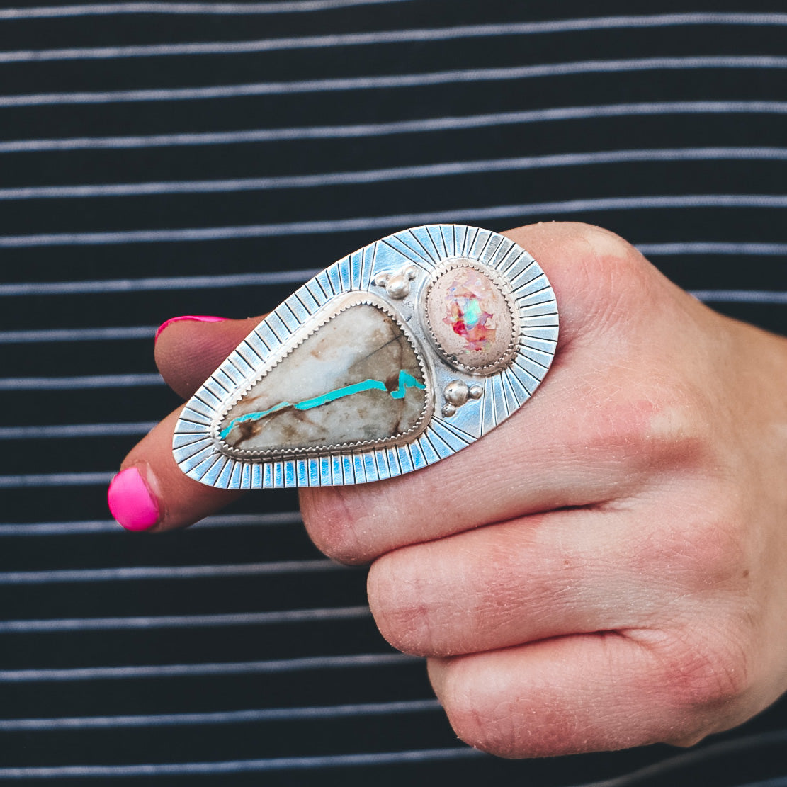 The Double Trouble design has become a Mineral + Mine signature style. This ring features a Royston Ribbon Turquoise accompanied by a flashy Mexican Opal. The Turquoise stone has a sandy matrix with a bright teal ribbon; the fire opal has a peachy matrix with a central pool of flashing pink and purple opal fire.