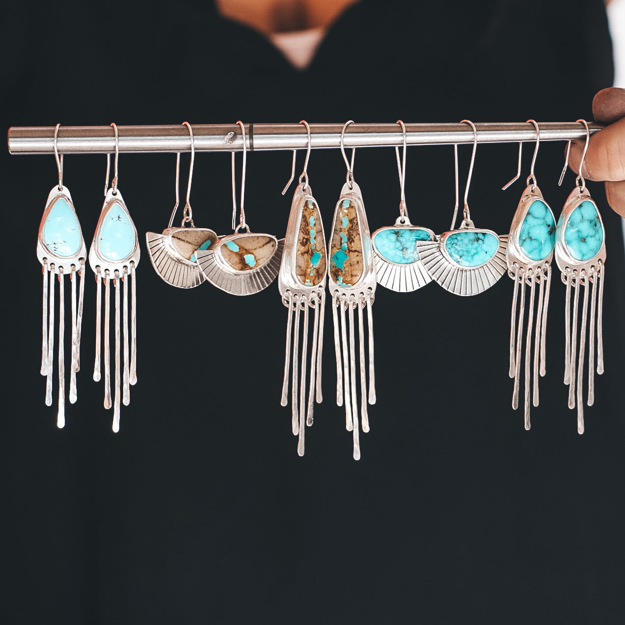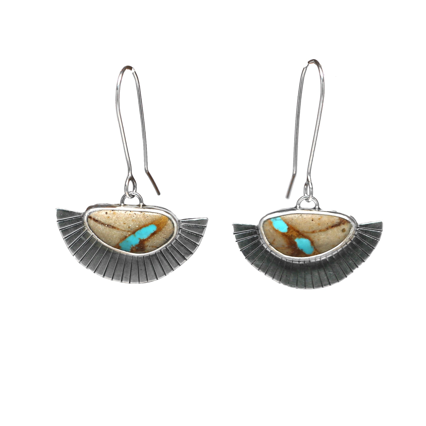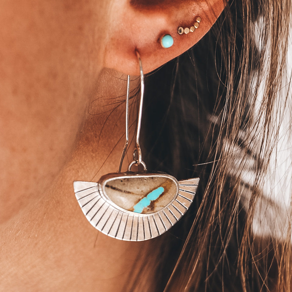 Lightweight as always, these fan earrings feature our signature straight line sunburst pattern alongside Royston Ribbon Turquoise. This pair of Royston stones have a sandy matrix with ribbons of bright teal.