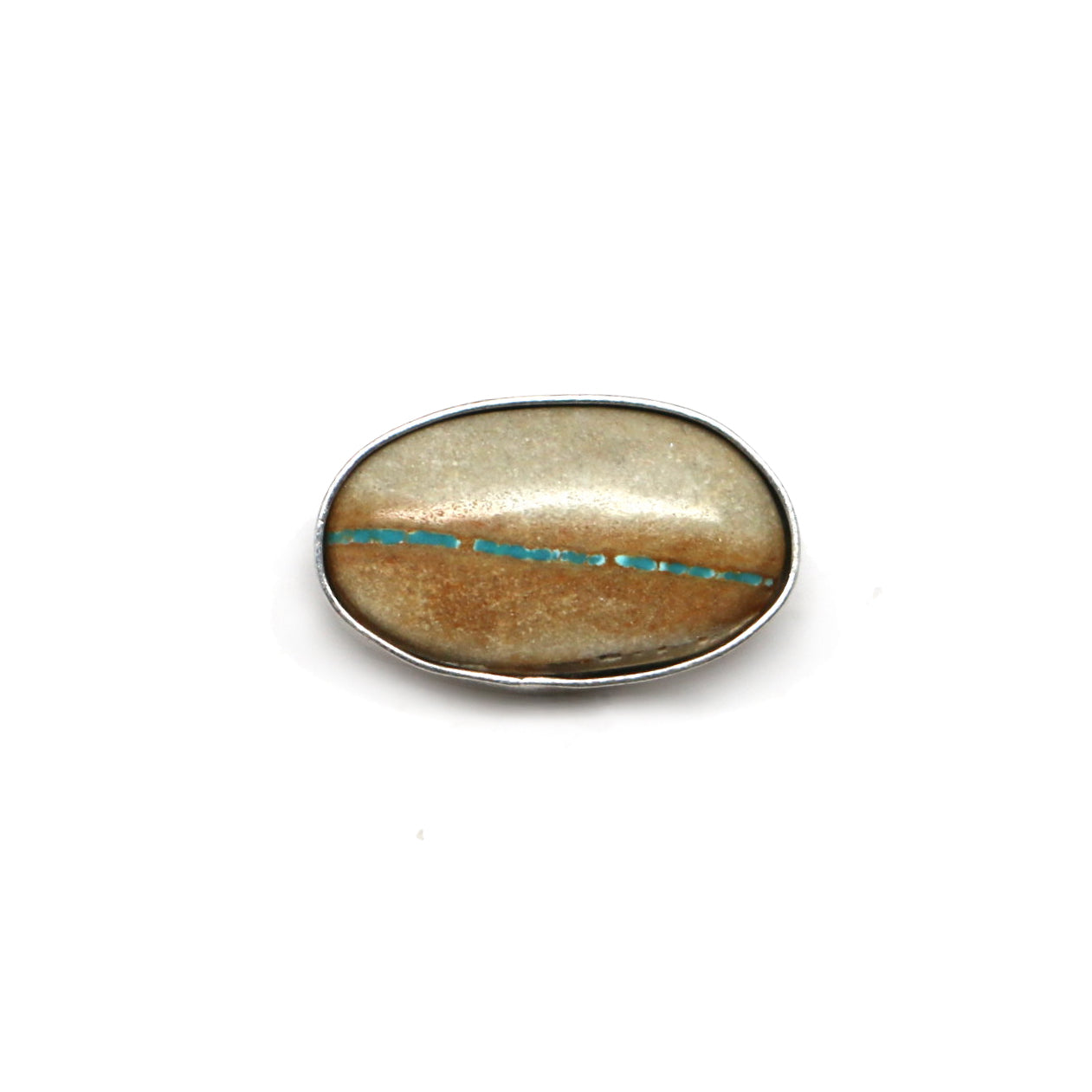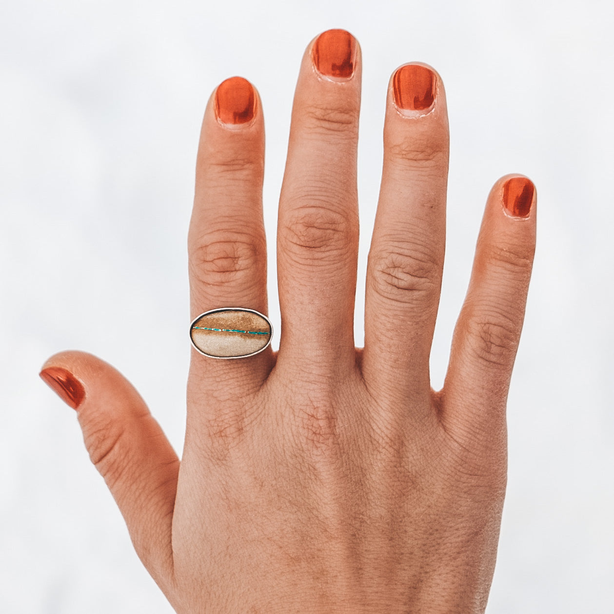 This horizontal Latitude ring features a Royston Ribbon turquoise stone in sandy brown with a thin green ribbon. The stone measures 12x20mm, and is set in sterling silver and fine silver.