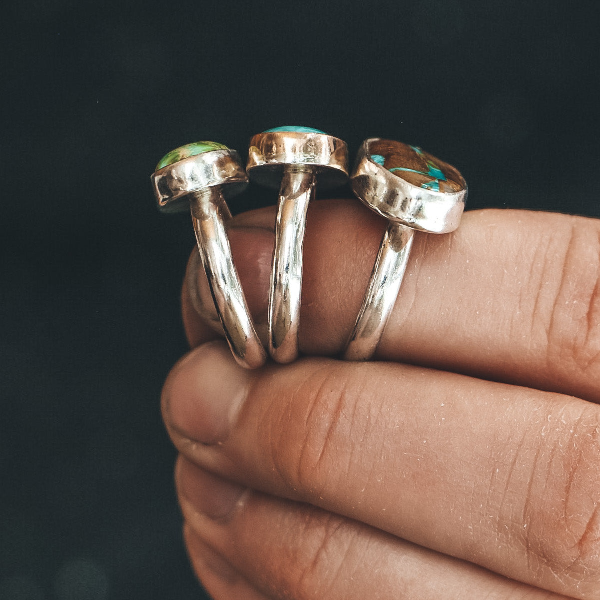 This horizontal Latitude ring features a Royston Ribbon turquoise stone with a brown matrix and bright teal ribbon.