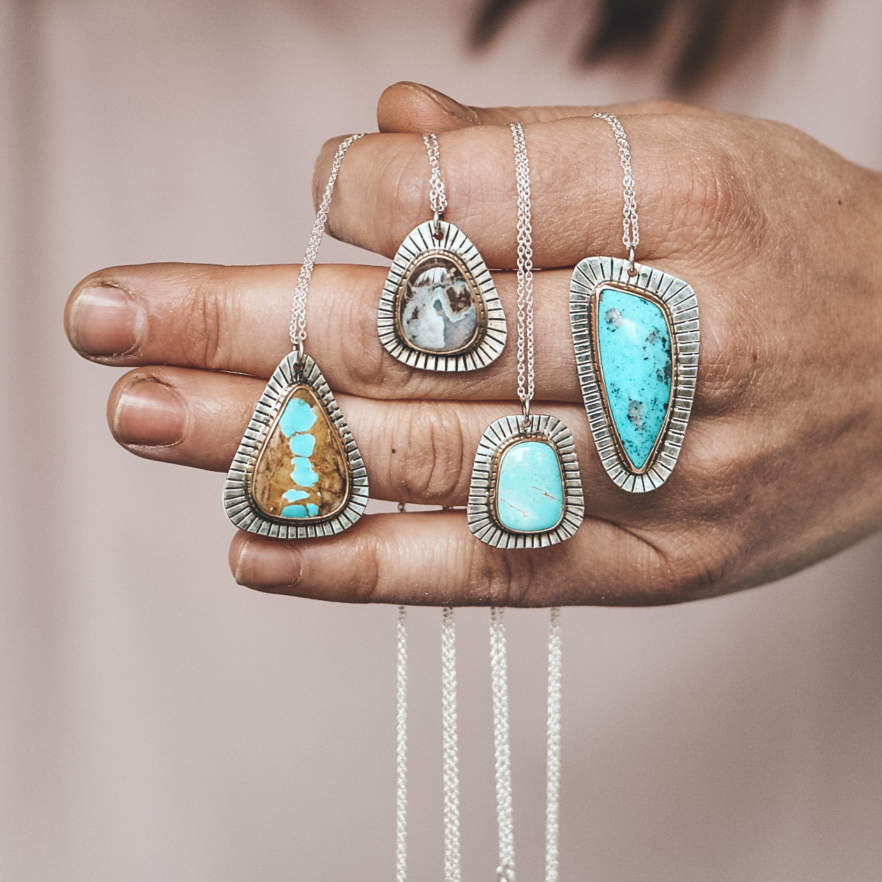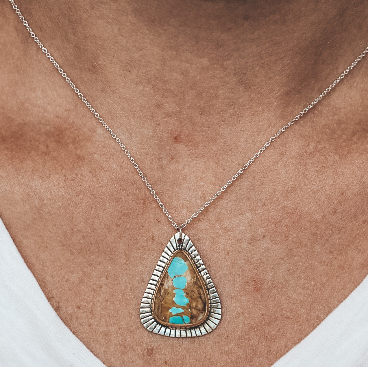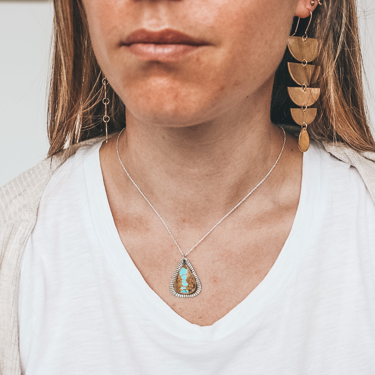 This mixed metal necklace features Royston Ribbon Turquoise set in a 14k gold filled bezel with a sterling silver backplate. This variety of turquoise, mined in Nevada, has a sandy tan matrix with bright turquoise ribbons. The pendant measures 22mm wide by 29mm tall, and is shown modeled on a 17" chain.