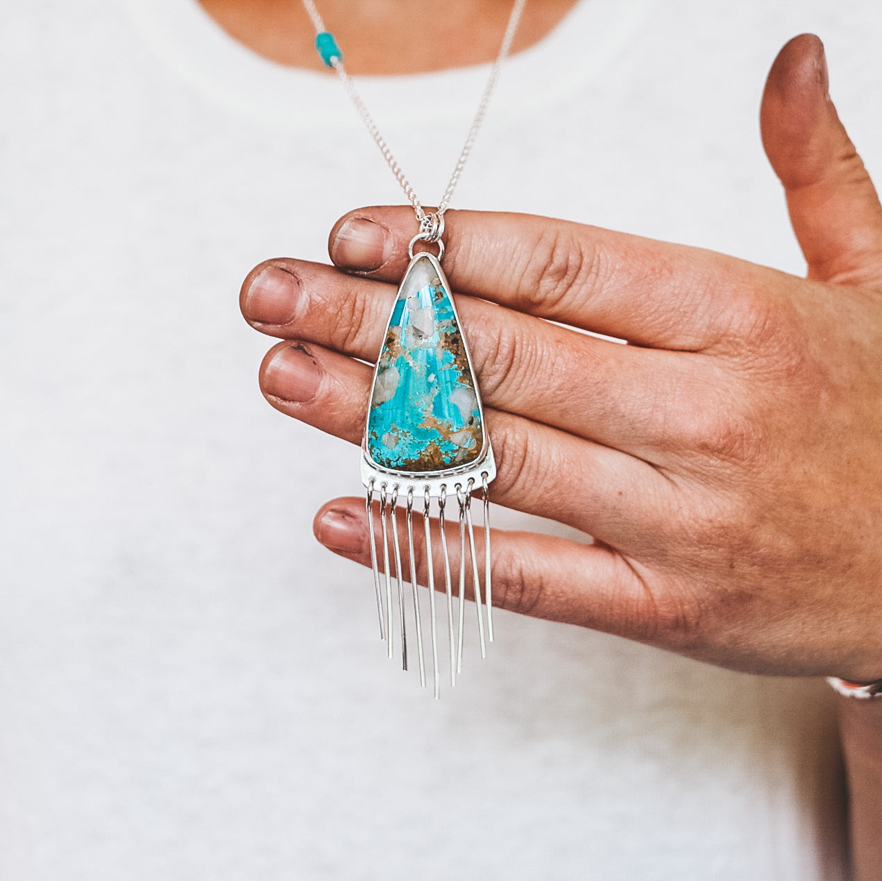 The pendant measures 3.75" tall by 1" wide, and comes on a 30" infinity chain. The sterling silver rope chain has floating wire-wrapped Sleeping Beauty Turquoise stones, which accent the pendant.