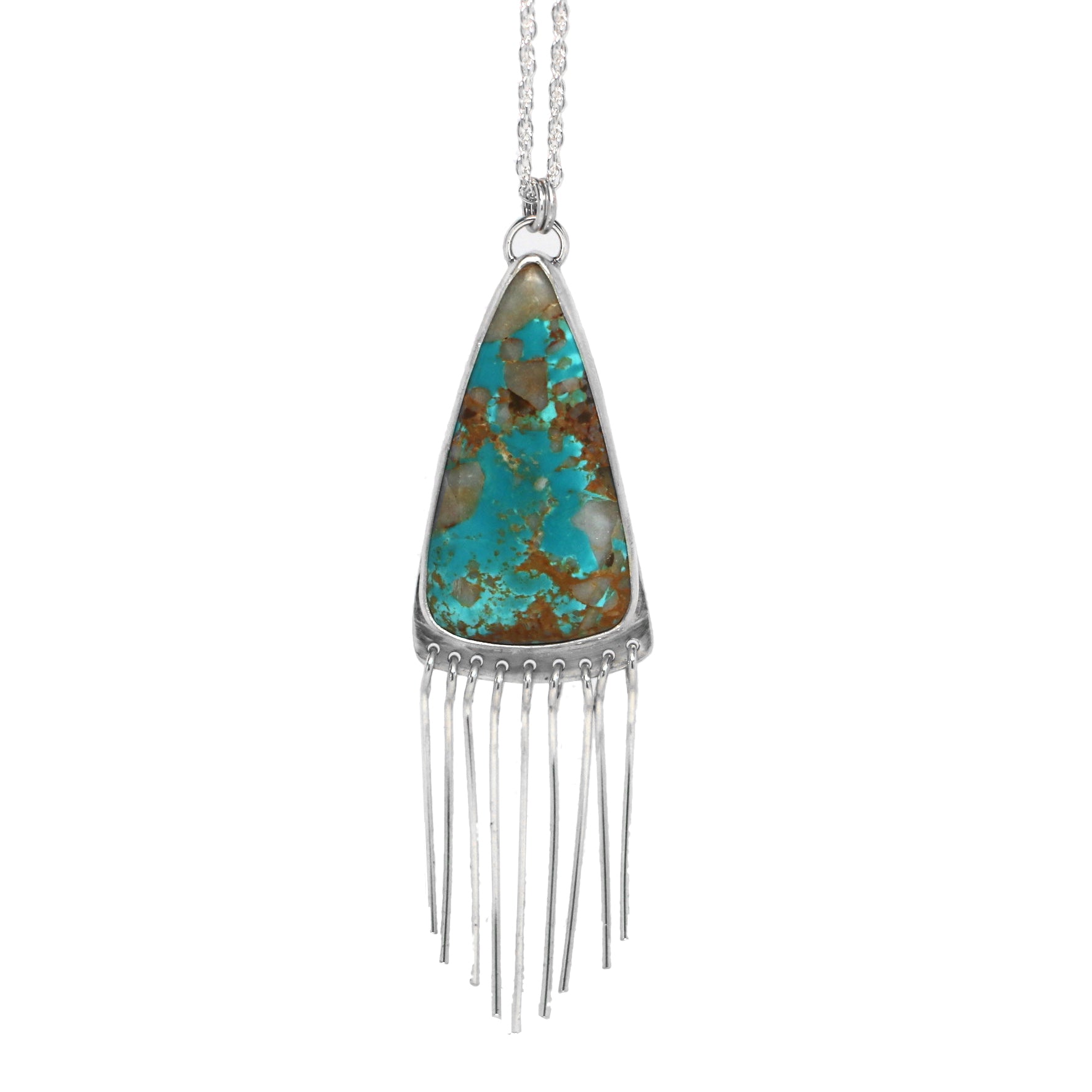 This necklace features Royston Turquoise set in sterling silver and fine silver, with handmade fringe. This variety of turquoise, mined in Nevada, is mixed in color, featuring teal, grey and sandy browns.