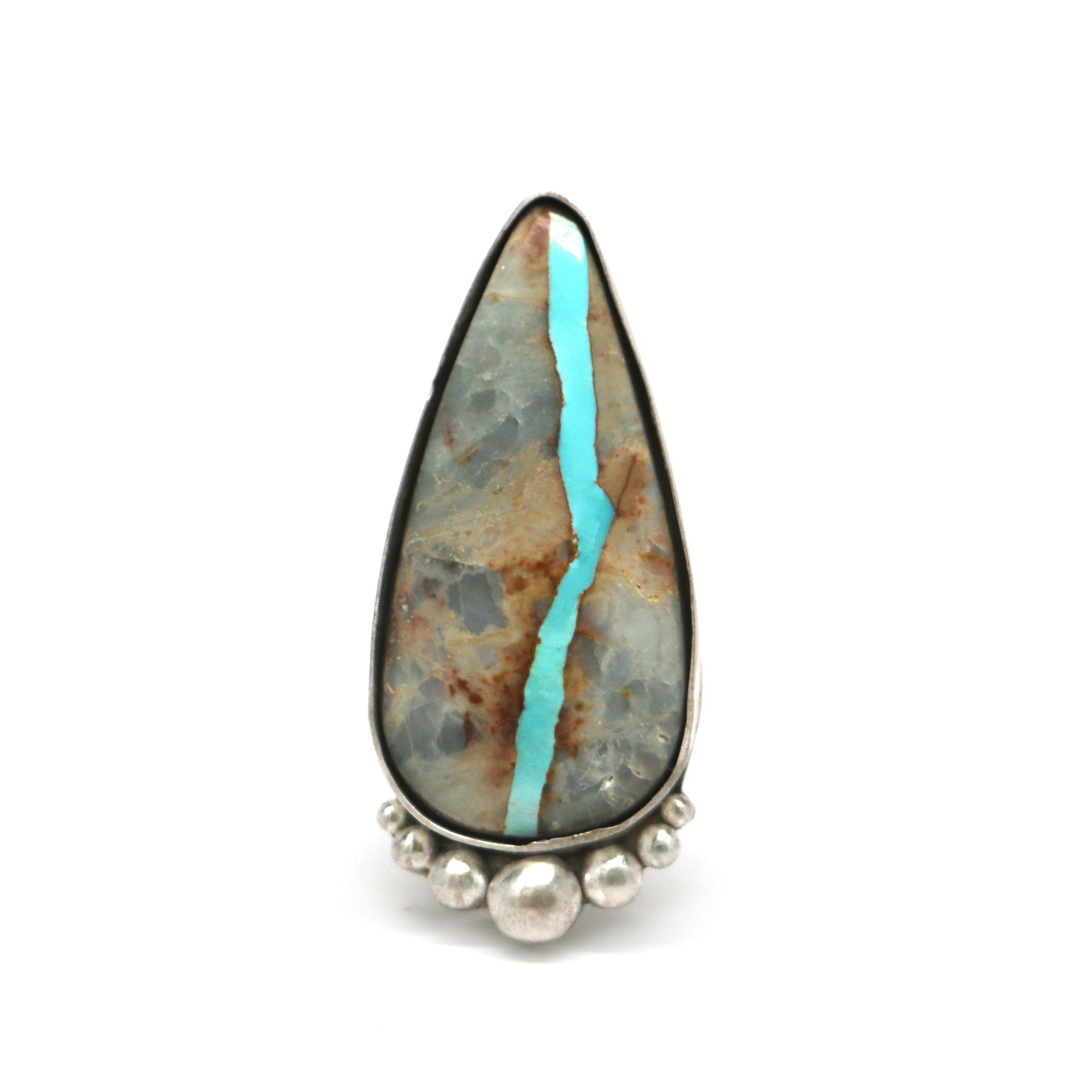 This Royston Ribbon turquoise is a sandy brown with a bright turquoise stripe. The stone measures 1.75" tall and .75" in width.