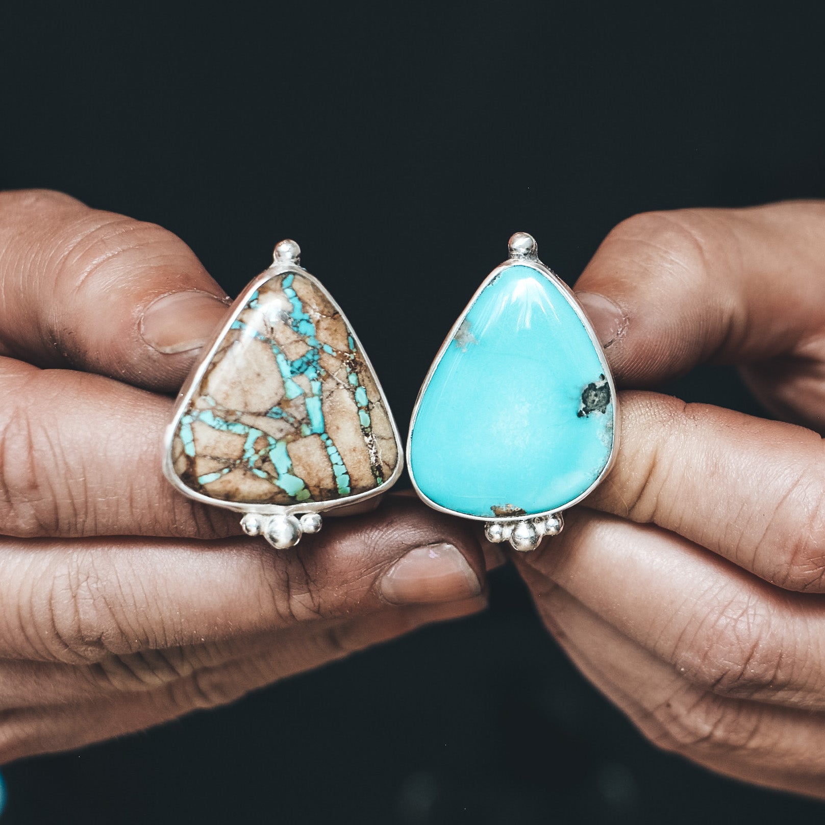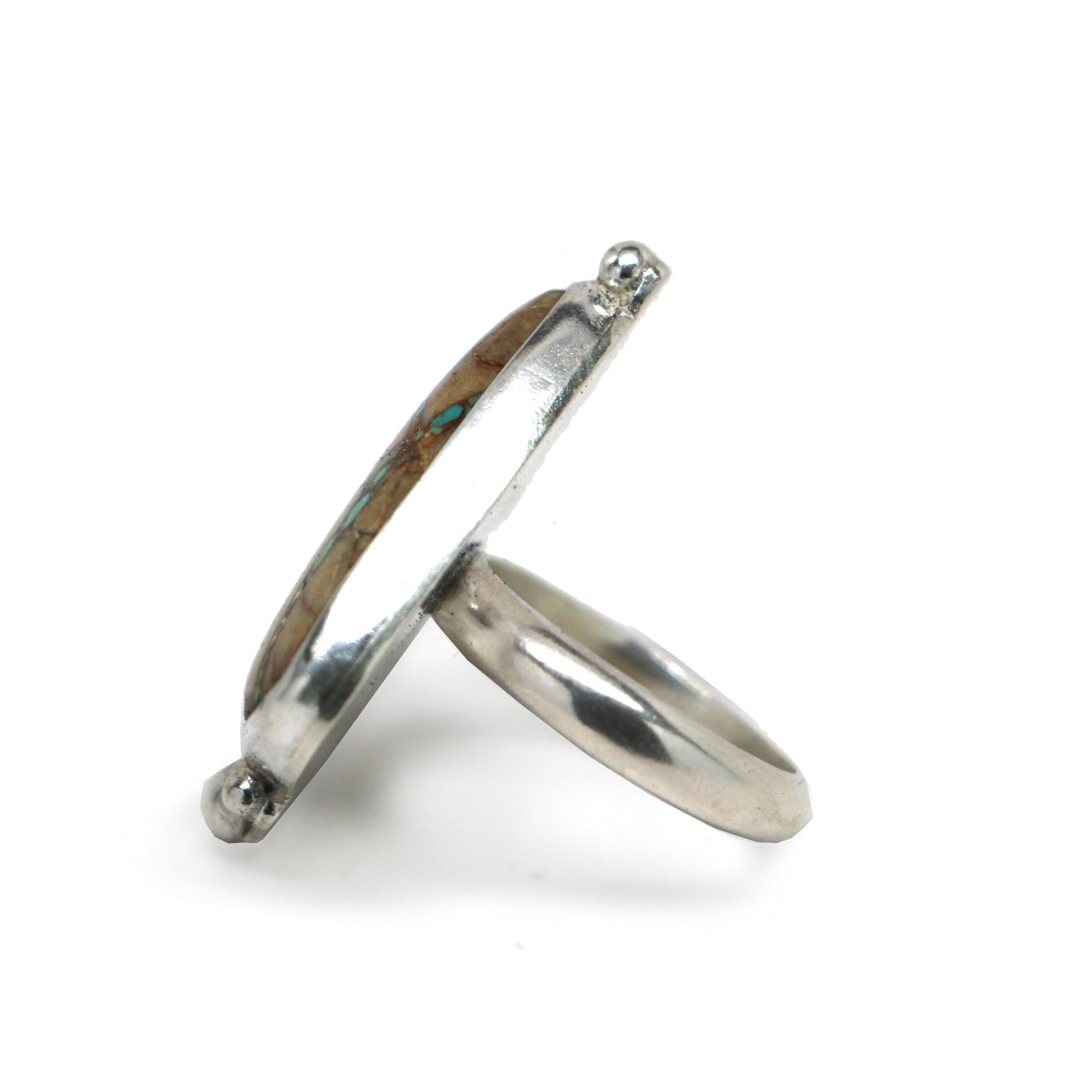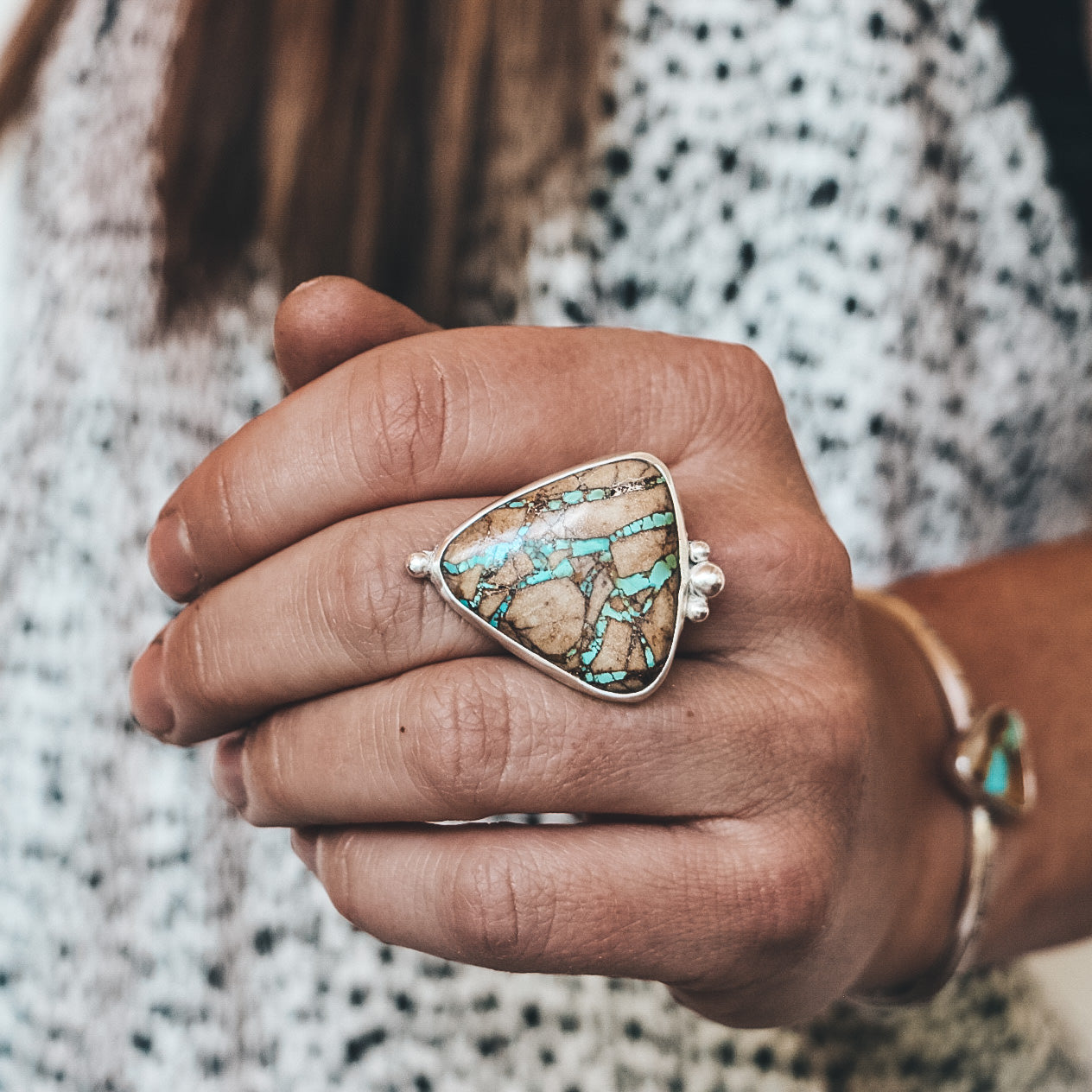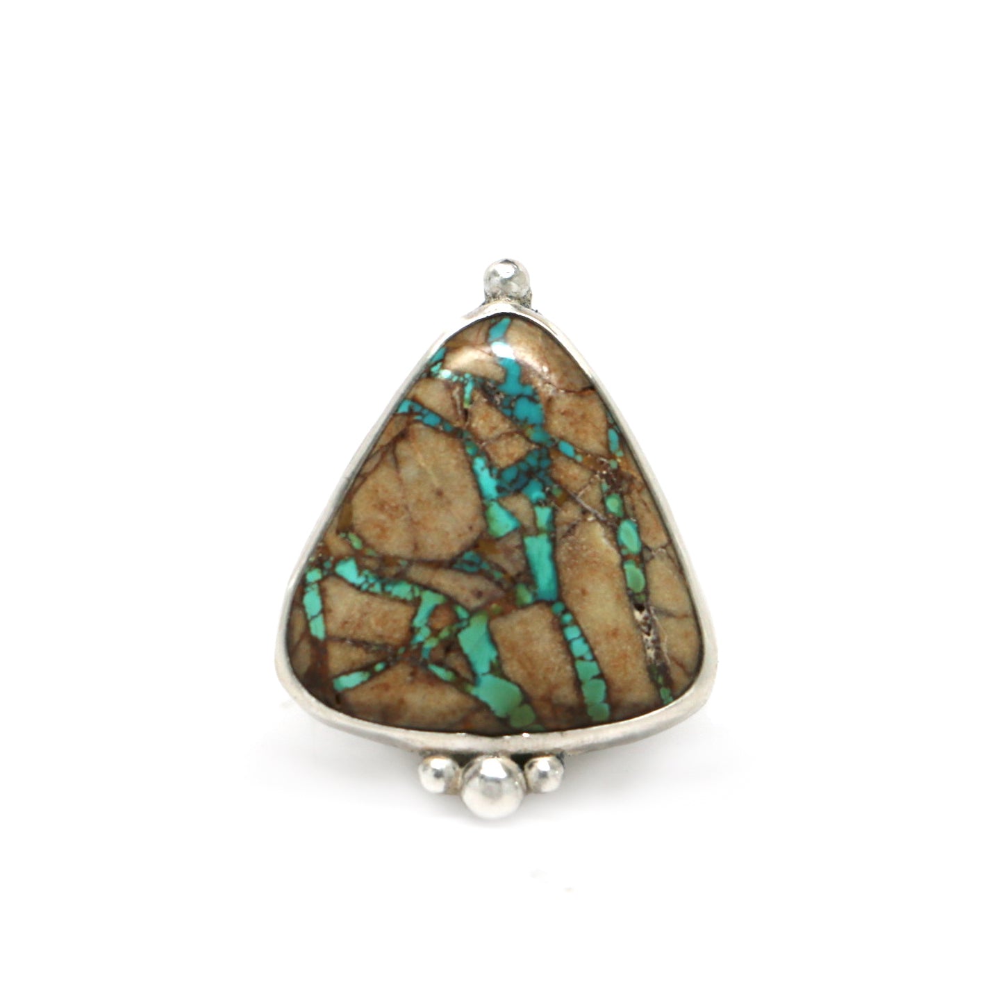 This triangular statement ring features a Royston Ribbon turquoise stone in sandy brown with bright green and teal ribbons. This beautiful piece of Royston Ribbon turquoise is natural and imperfect, with some surface irregularities and texture that , in our opinion, make this gorgeous stone 'perfectly imperfect.' The ball embellishments are hand formed from fine silver.