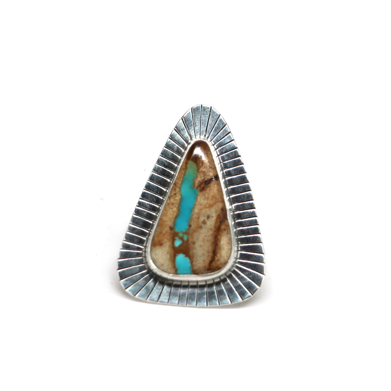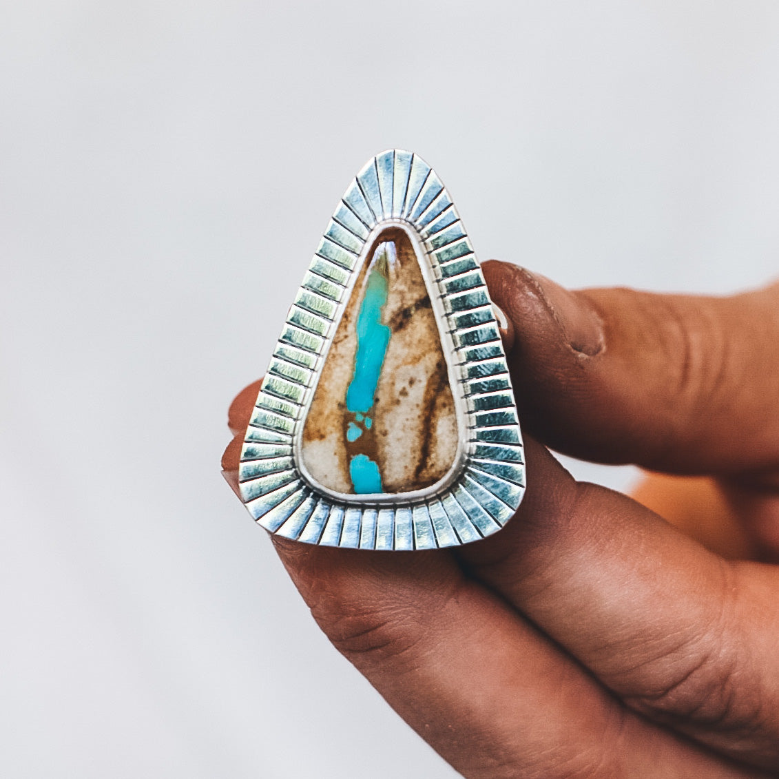 The Sunbeam design has become a Mineral + Mine signature style. This ring features a large Royston Ribbon Turquoise, sandy in color with a bright teal ribbon up the middle. The stone is set in sterling silver and fine silver, with Mineral + Mine's signature precise Sunbeam pattern surrounding the stone.