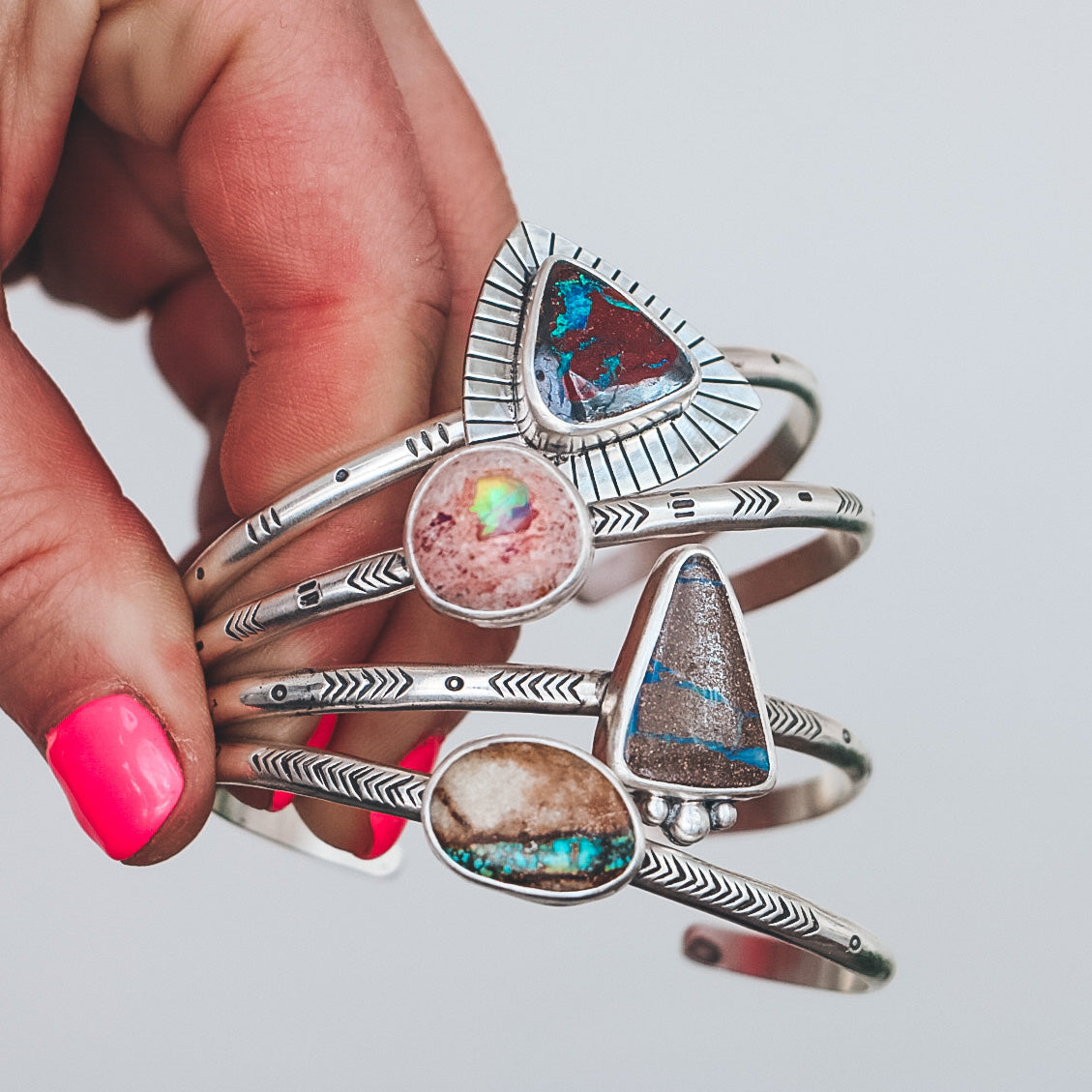 The cuff is made from sterling silver and fine silver, and features a hand-stamped band. The stone measures 19mm wide by 13mm tall.