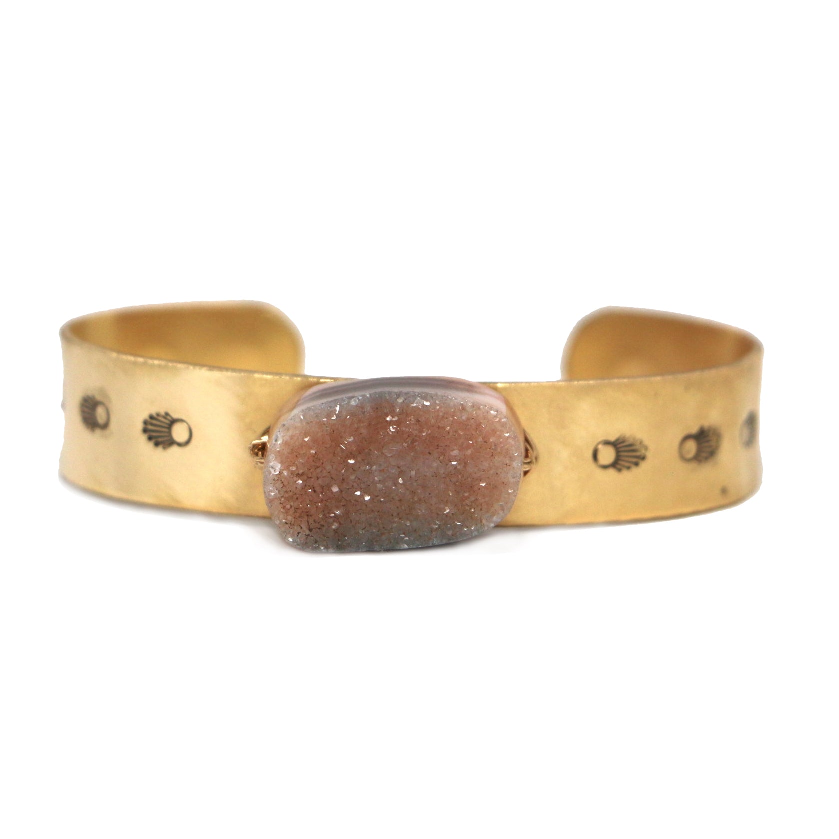 This cuff features a natural, one-of-a-kind agate druzy in peachy-grey. The cuff measures 6" with a 1" gap, and will fit most 'average' women's wrists. This cuff can be sized down by request at no extra charge - just send us a message after purchase, or leave a request in the 'notes' section at checkout.