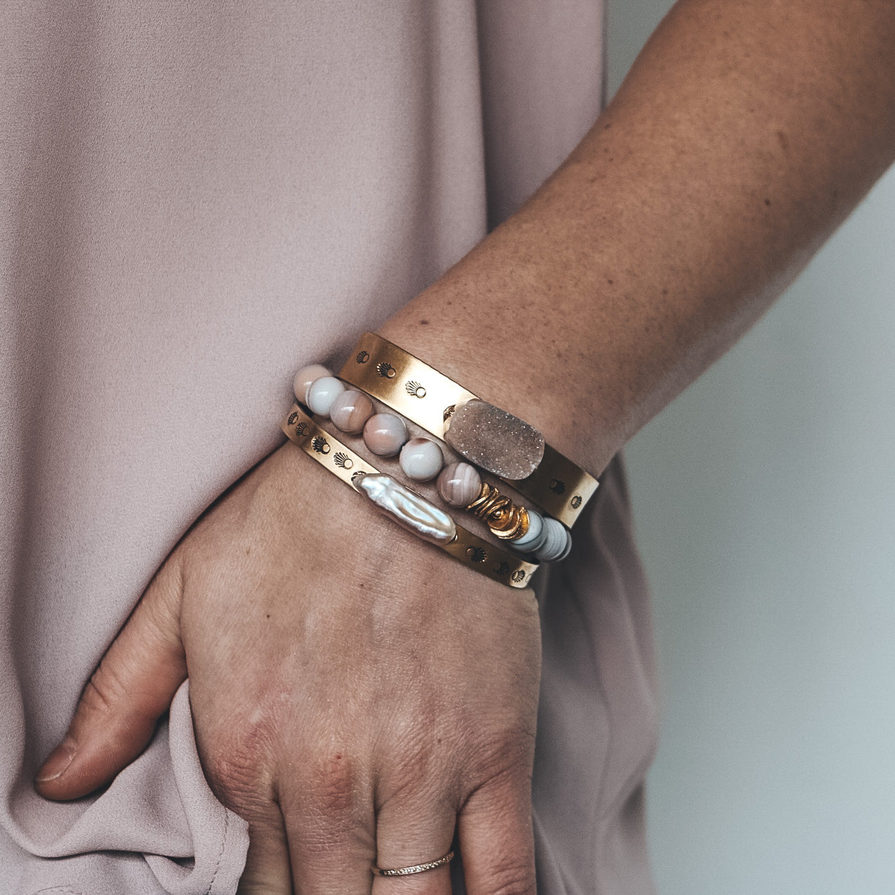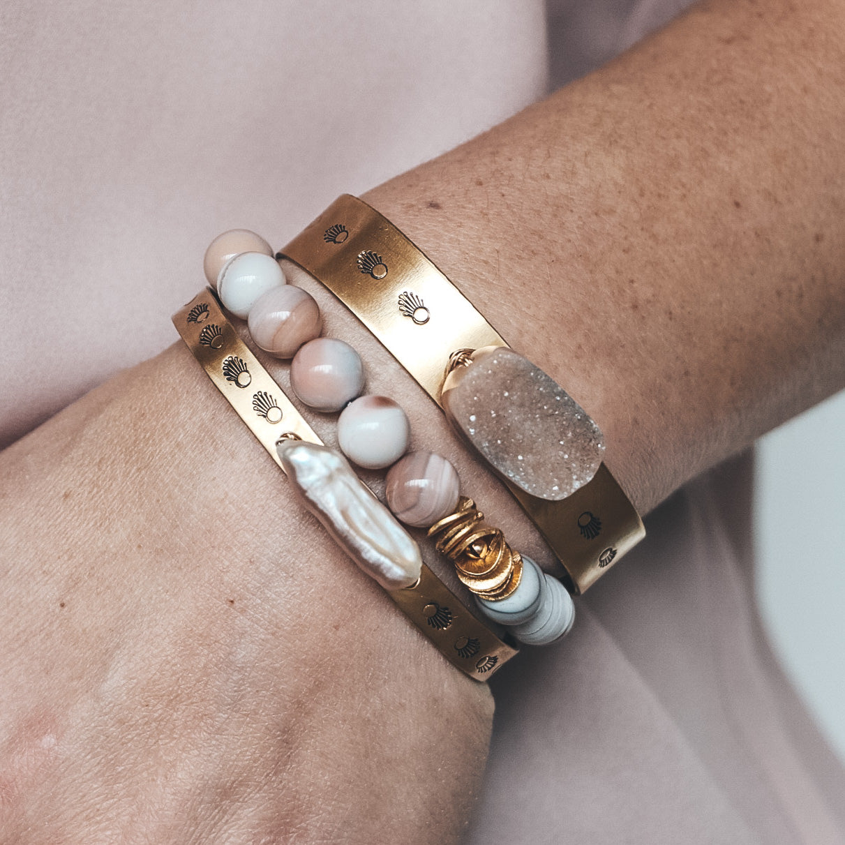 The new Selene cuff is hand-stamped brass with a gemstone centerpiece - perfect to mix into your stack!