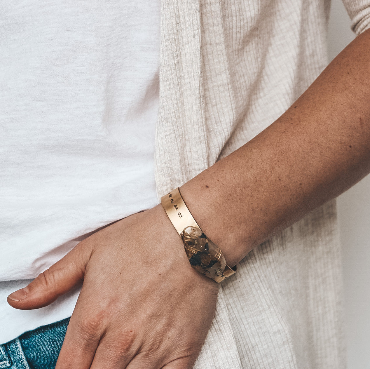 The new Selene cuff is hand-stamped brass with a gemstone centerpiece - perfect to mix into your stack!