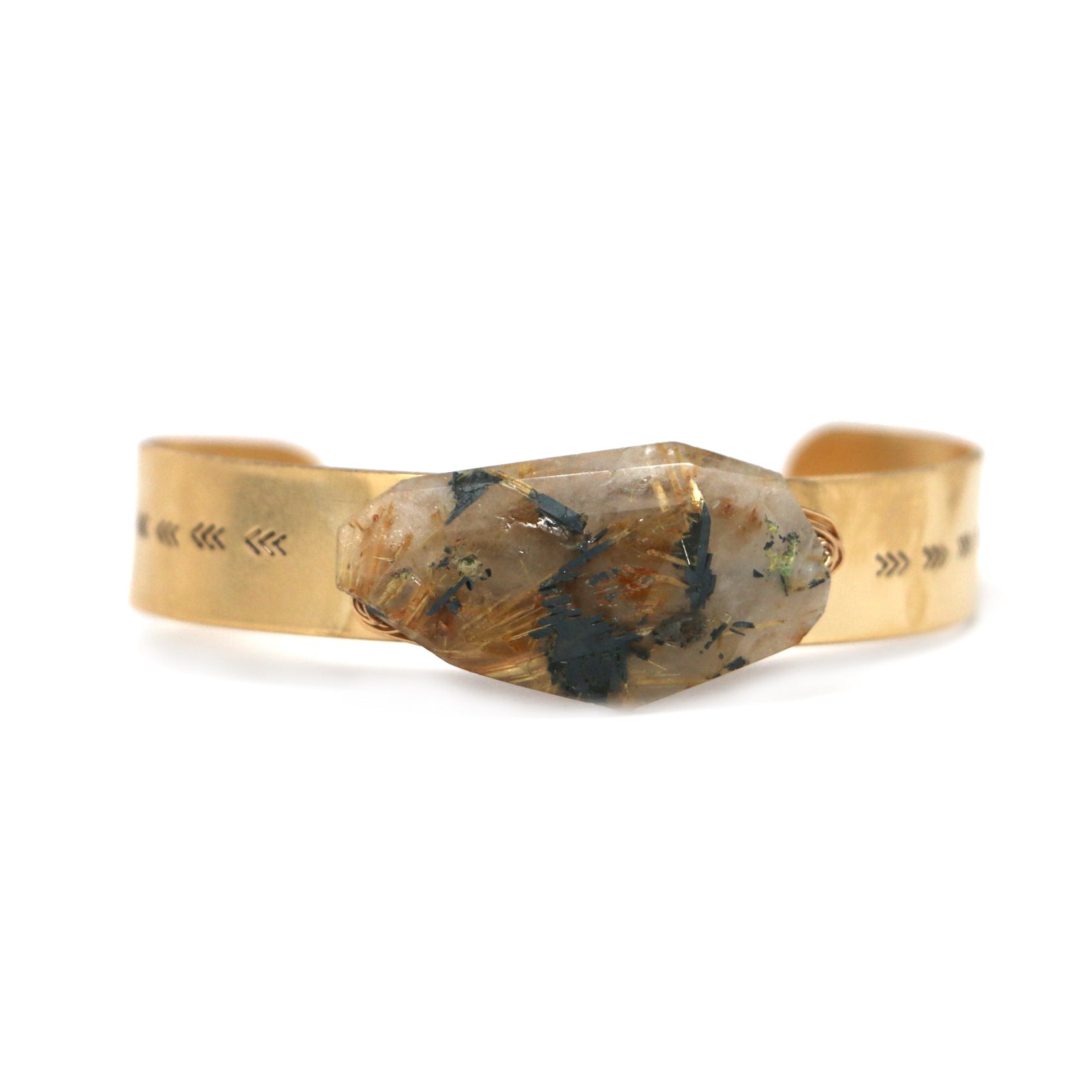 This cuff features a natural, one-of-a-kind golden rutile quartz stone. The cuff measures 6" with a 1" gap, and will fit most 'average' women's wrists. This cuff can be sized down by request at no extra charge - just send us a message after purchase, or leave a request in the 'notes' section at checkout.