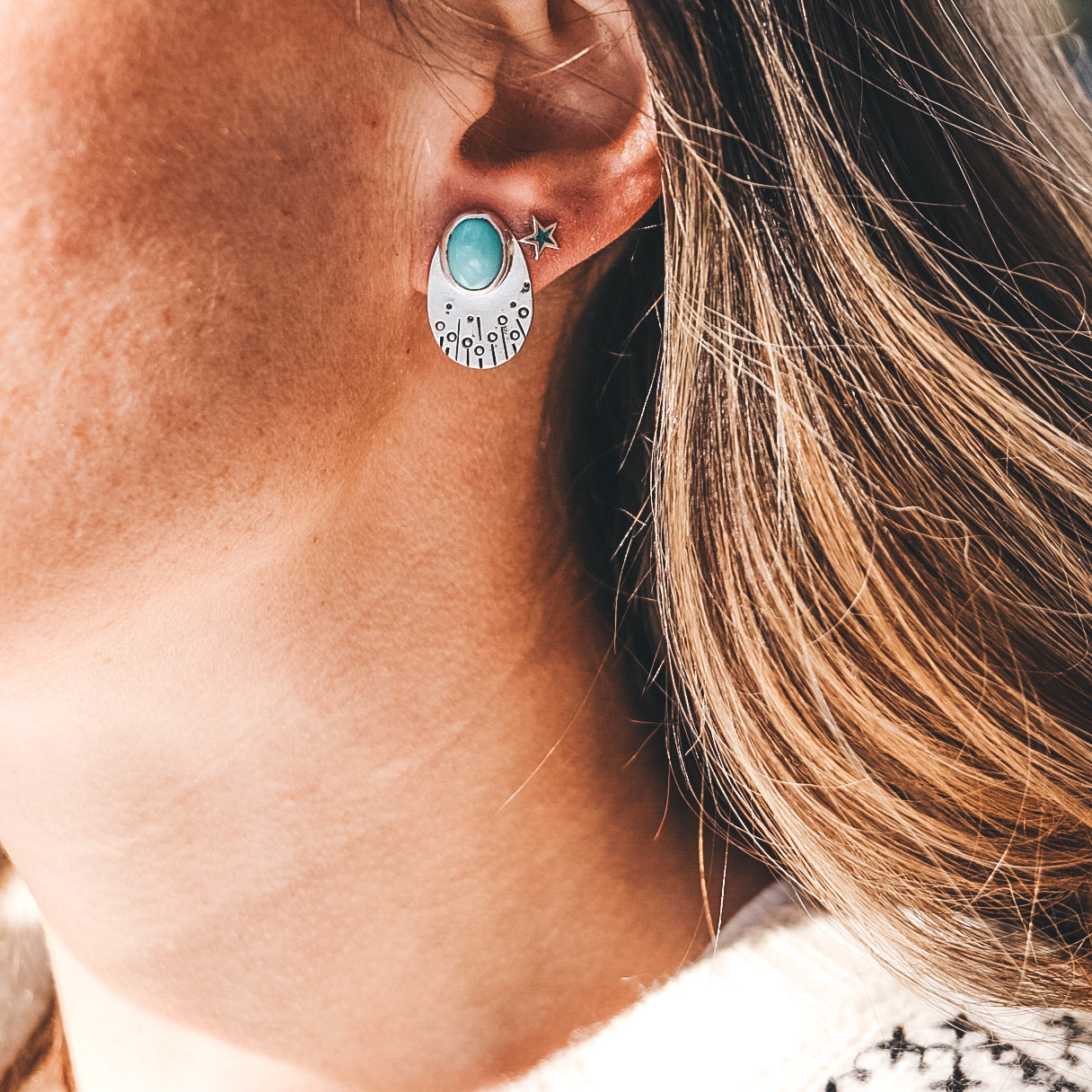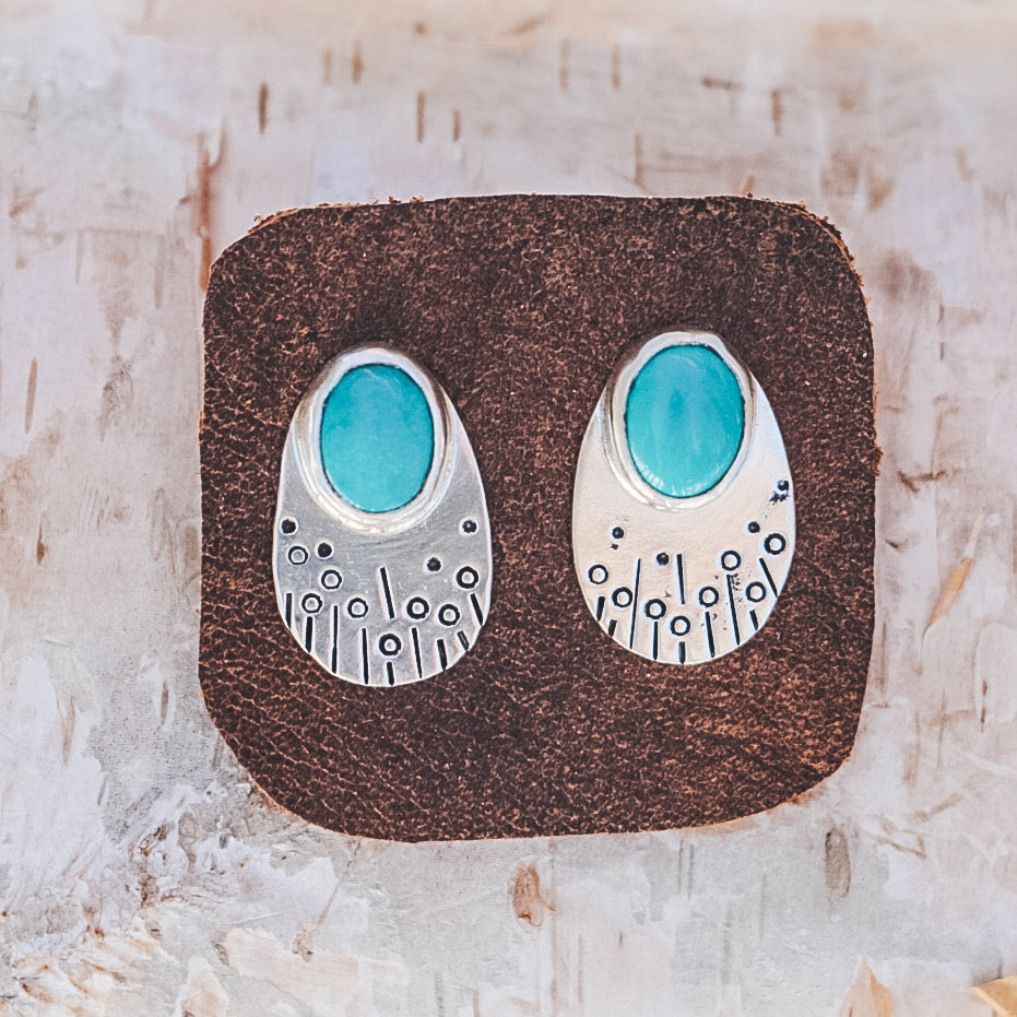 This pair of Silvery Blue Studs features a pair of Hubei Turquoise stones, and are set in sterling silver.