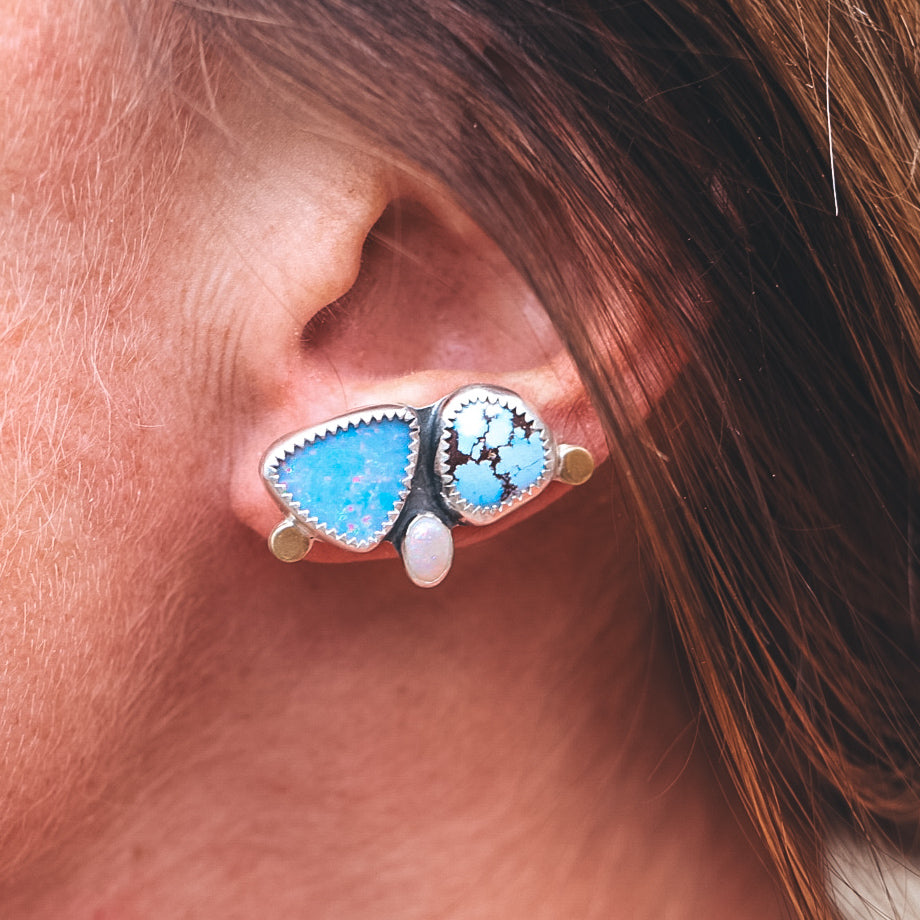 Featuring stunning Australian Opal Doublets and Golden Hills Turquoise, these earrings can be worn hanging down or 'climbing' up the ear.
