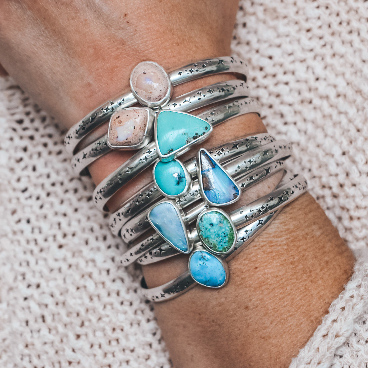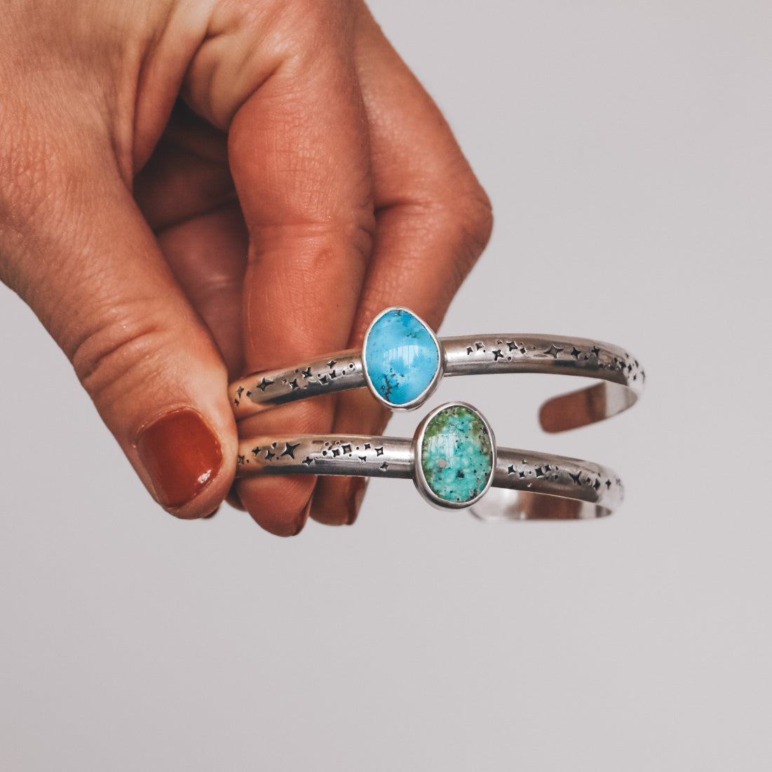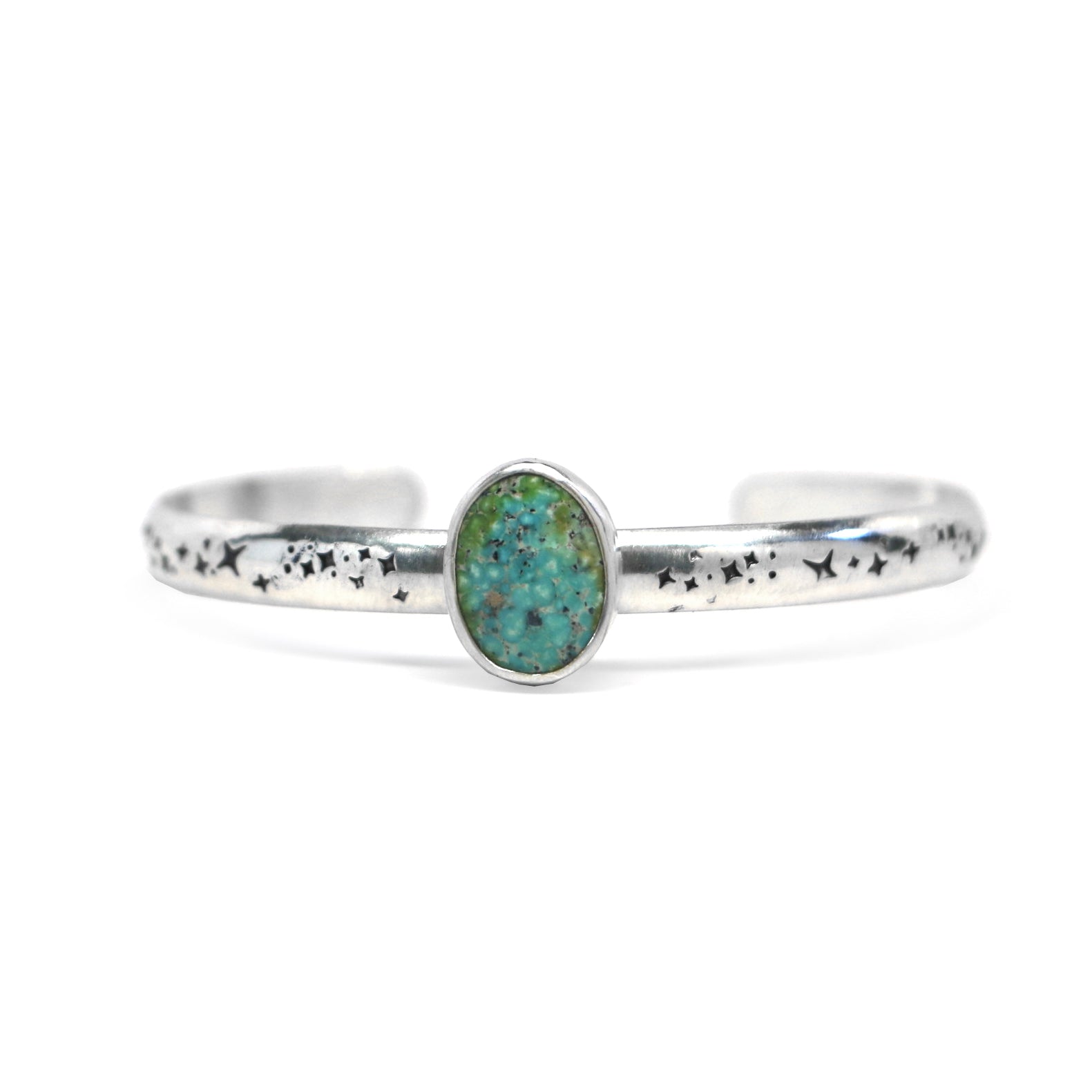 This one of a kind cuff features a brilliantly teal Campitos Turquoise, mined in Sonora, Mexico. The stone has flecks of natural pyrite inclusions. This bracelet is made from sterling silver and fine silver, and features a hand-stamped cuff with a celestial pattern. The triangular stone centerpiece measures 12mm in width and 15mm tall.