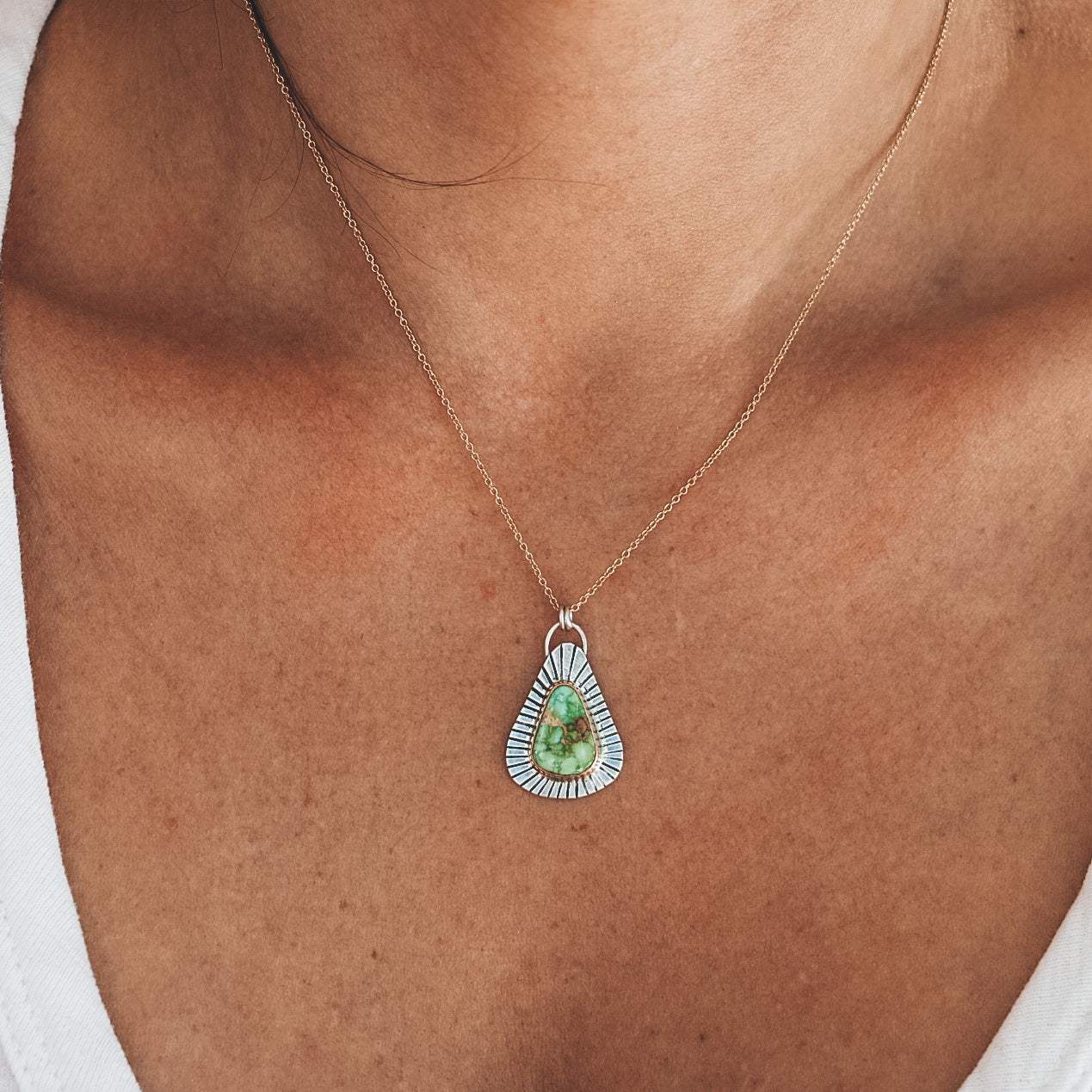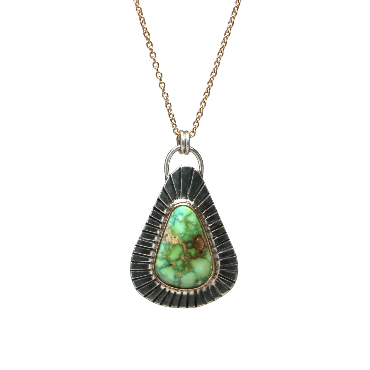 This necklace features Sonoran Gold Turquoise, mined in Mexico. This top quality stone is brilliant green with tan veining, and has natural flecks of pyrite inclusions. This piece is mixed metals, with a sterling silver backplate and bail, and 14k gold filled bezel. The pendant measures 29mm tall by 13mm wide.