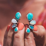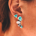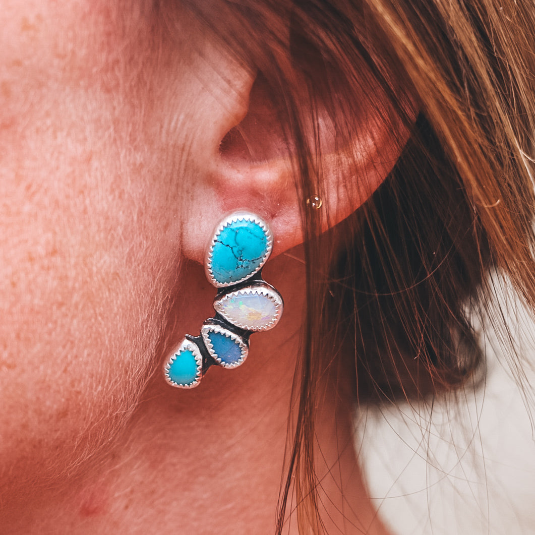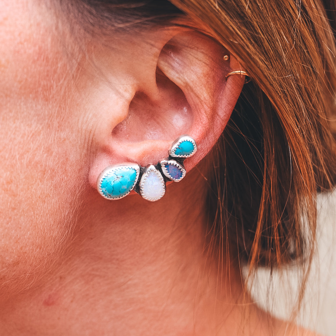Featuring Hubei Turquoise, solid Australian Opals, and Australian Opal Doublets, these earrings can be worn hanging down or 'climbing' up the ear.