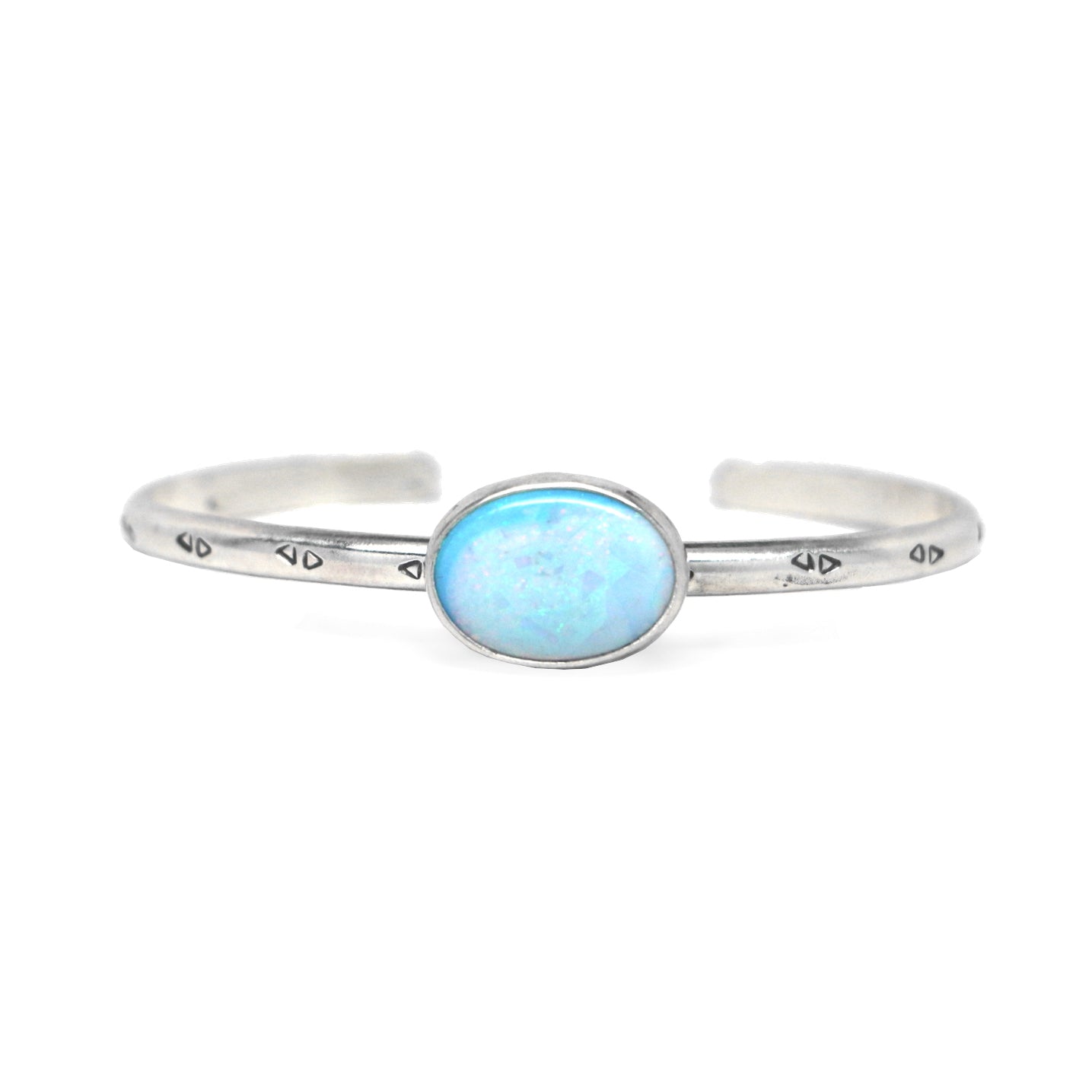 This one-of-a-kind cuff features Sterling Opal set in sterling silver and fine silver. Sterling opals are lab grown stones which have the same structural makeup as naturally occurring opals, but are less likely to crack when set into jewelry. The stone is framed in fine silver, and measures 19mm wide by 14mm tall.