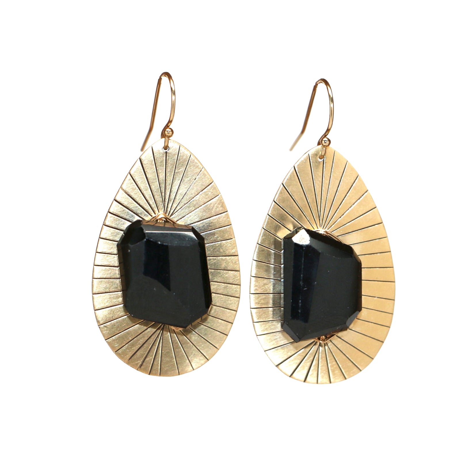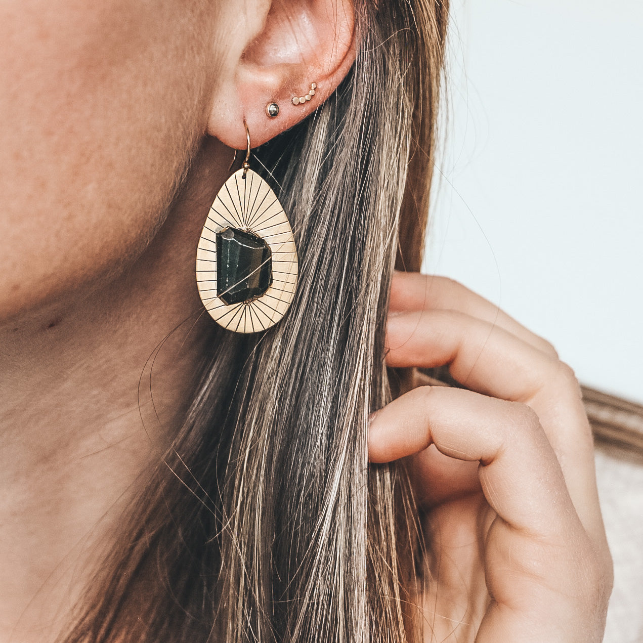 The new Sunbeam earrings are handcrafted from brass with 14k gold filled earwires. This pair features a pair of 'sister' spinel stones, hand-matched for their complementing balance. Earrings hang approximately 1.75" in length and are lightweight.